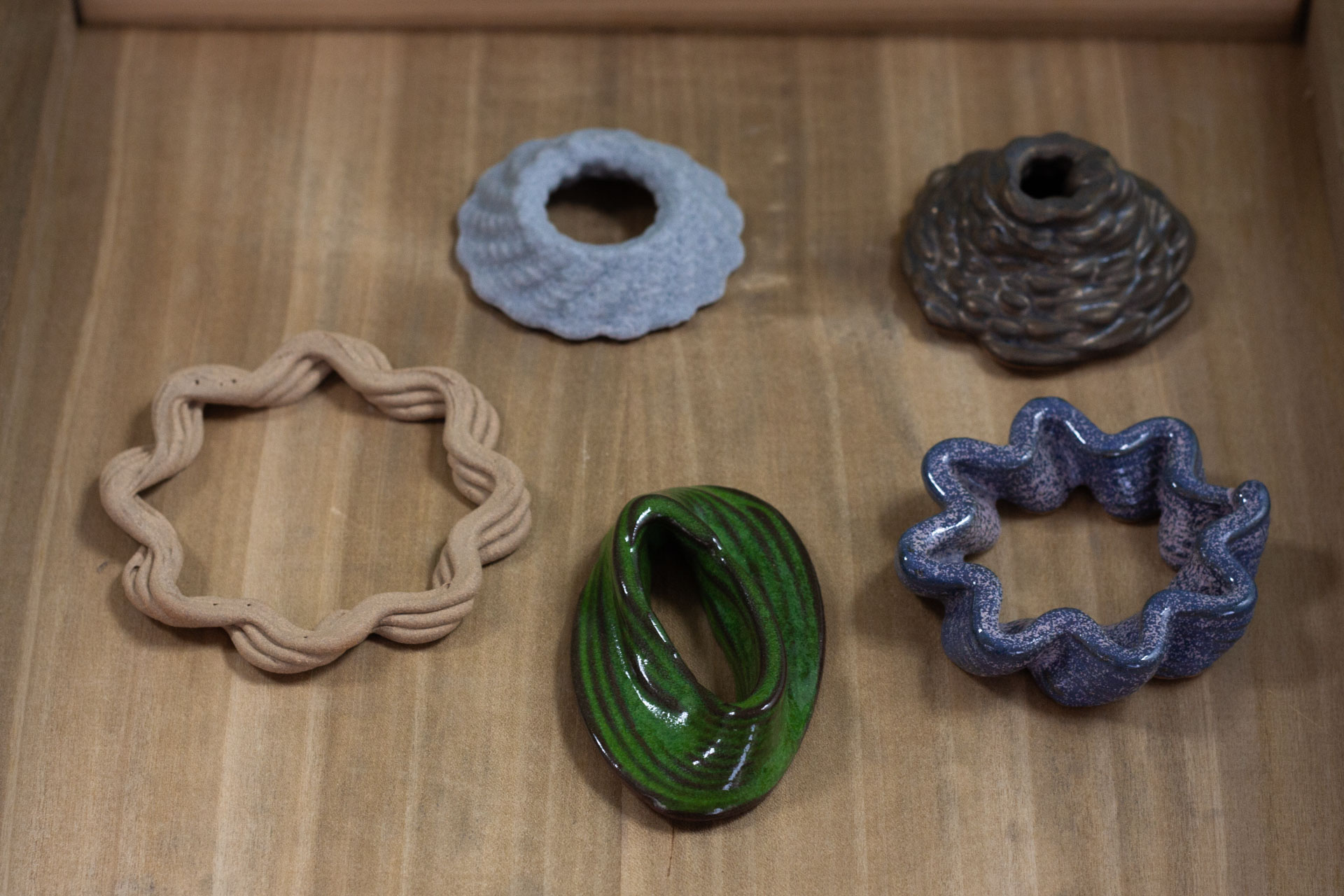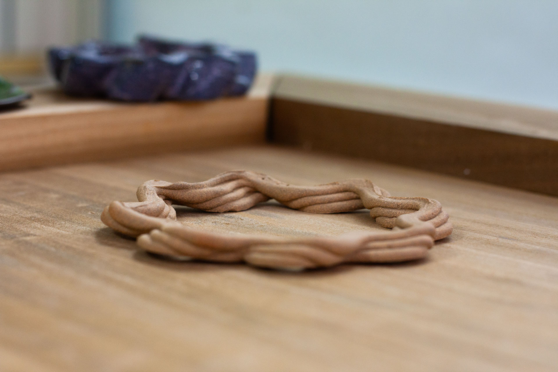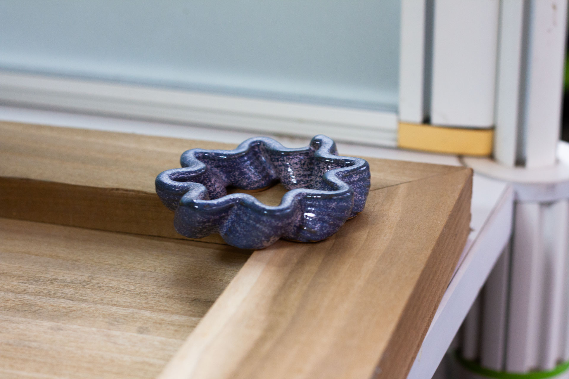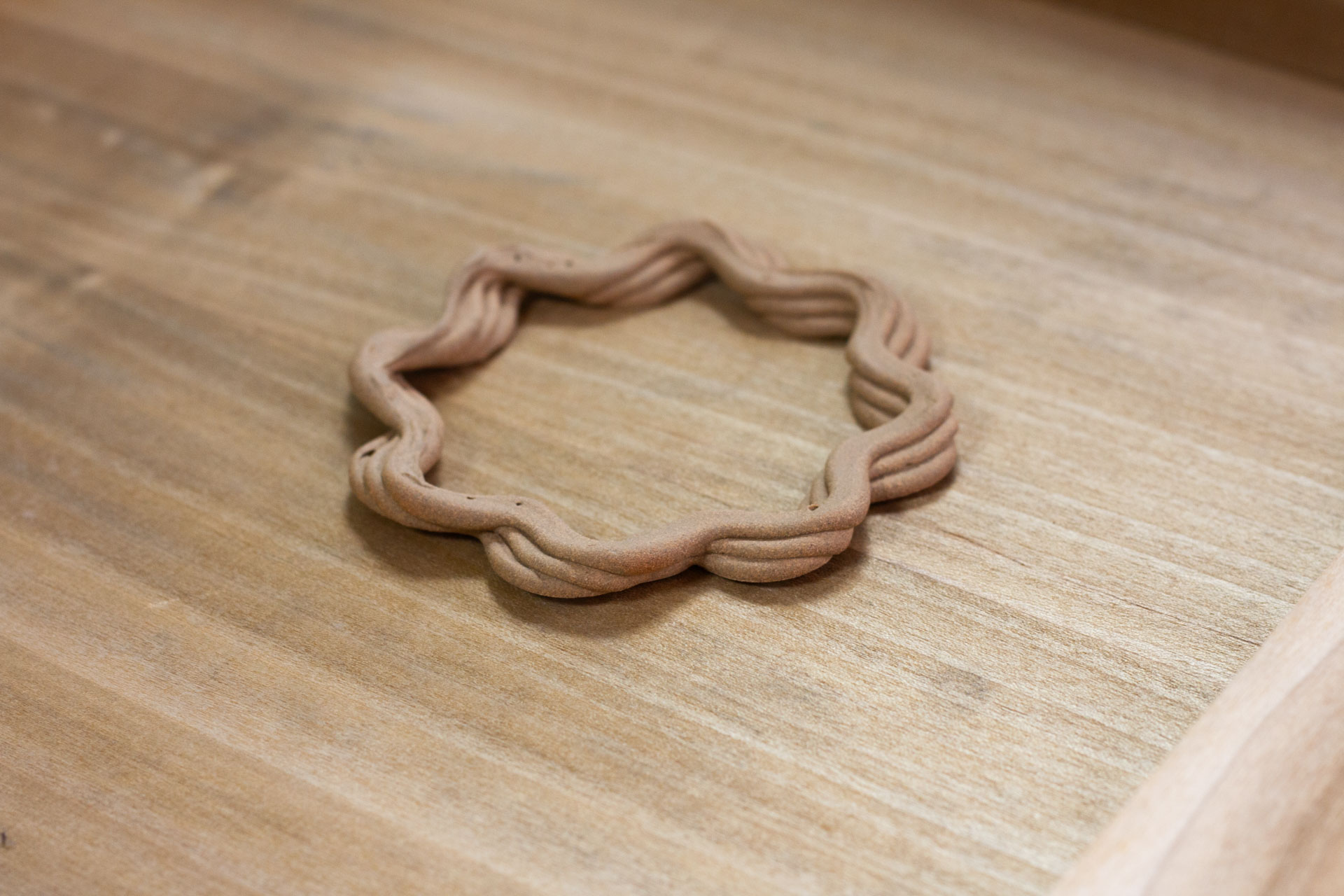 參數幾何彩漸變花叢這次受到國立陽明交通大學建築研究所、應用藝術研究所學生團隊的委託討論土的適合施作程度以及上釉。該學生團隊利用KUKA機器手臂以及自行設計的噴嘴以及推進器來3D列印陶瓷,並使用參數化程式grasshopper來繪製以及切片模型,列印出嚴謹也富含美感的圖樣。最後再委託我們上釉燒製。非常令人激賞的利用科技輔助陶瓷創作的作品。