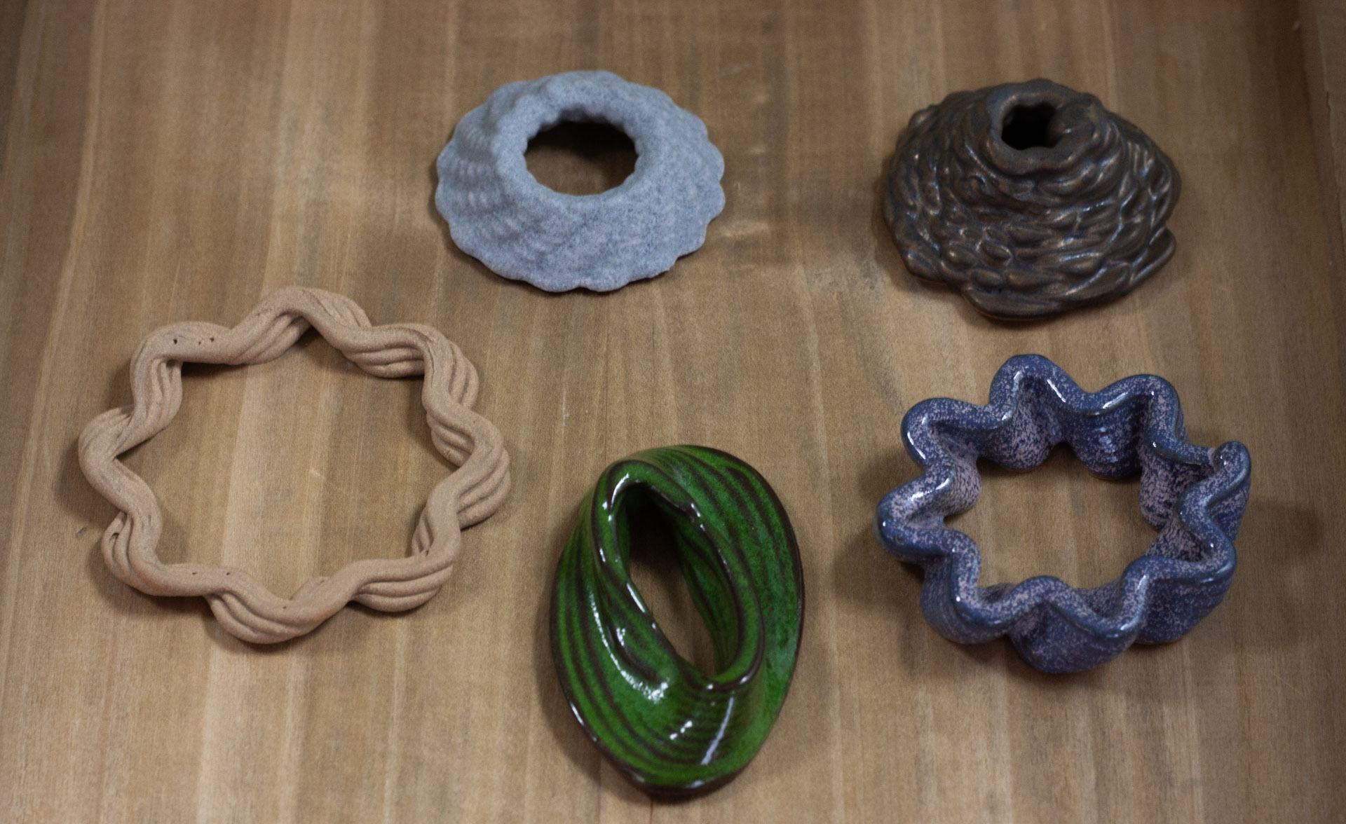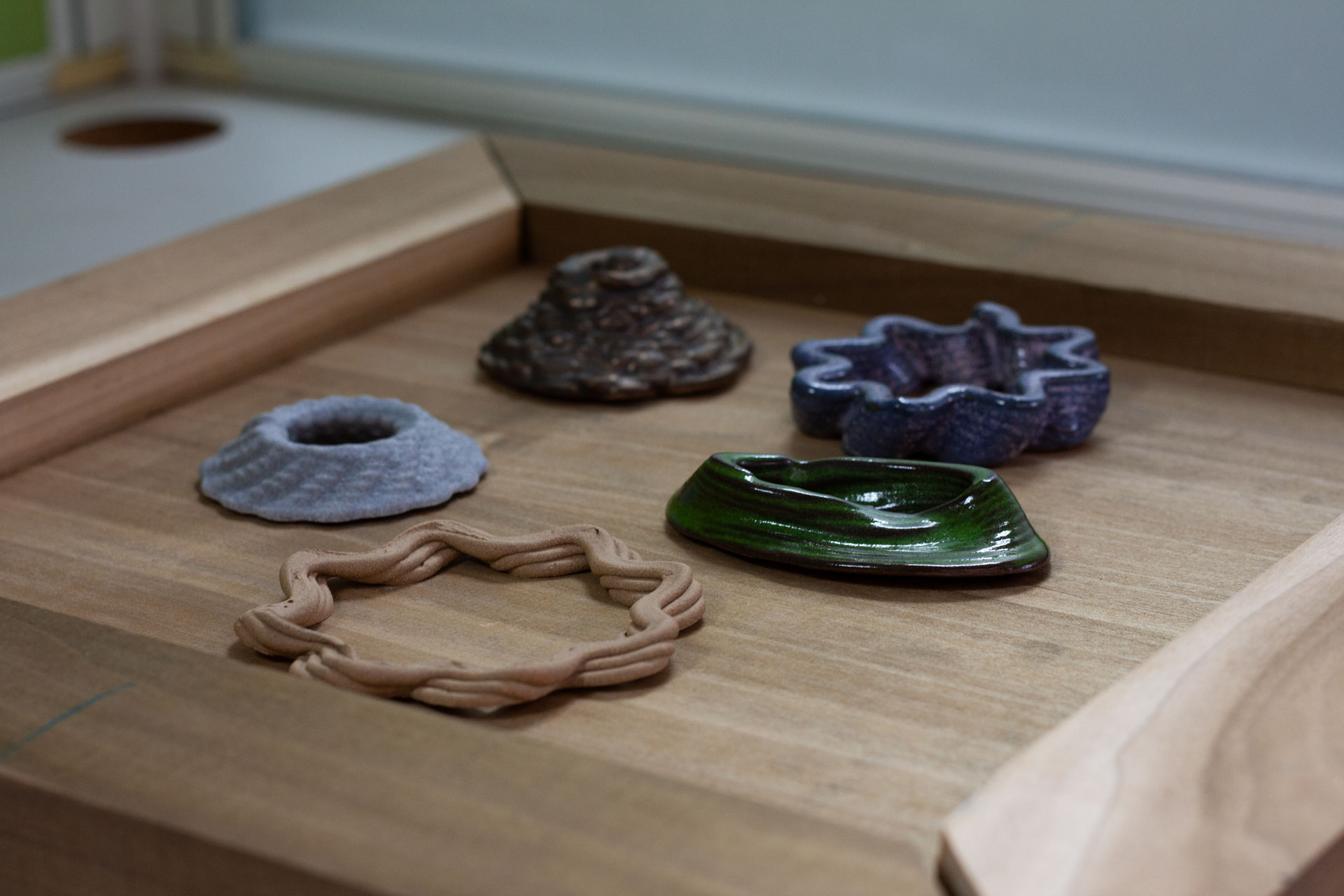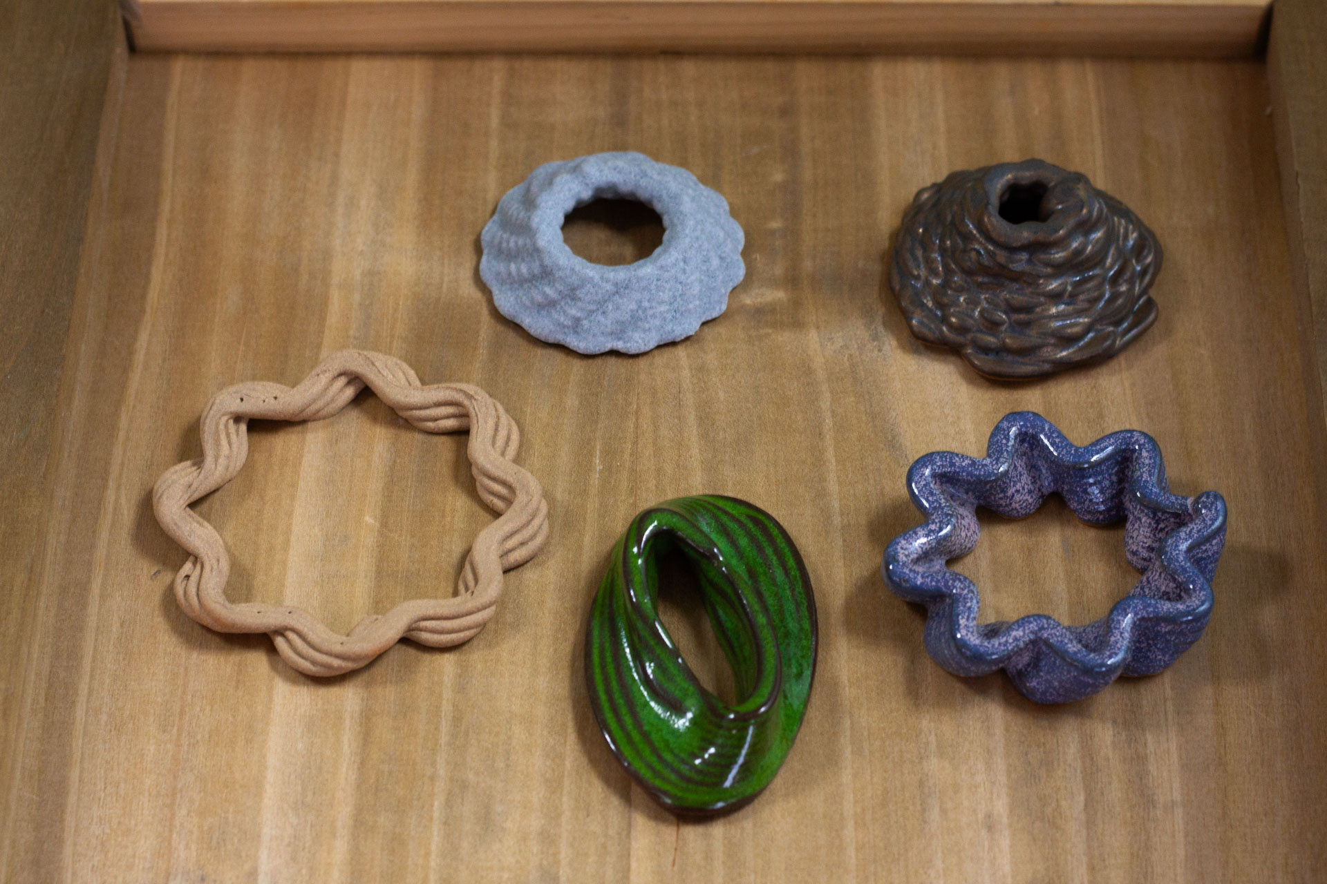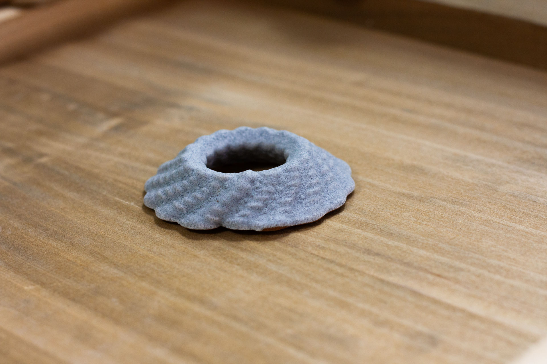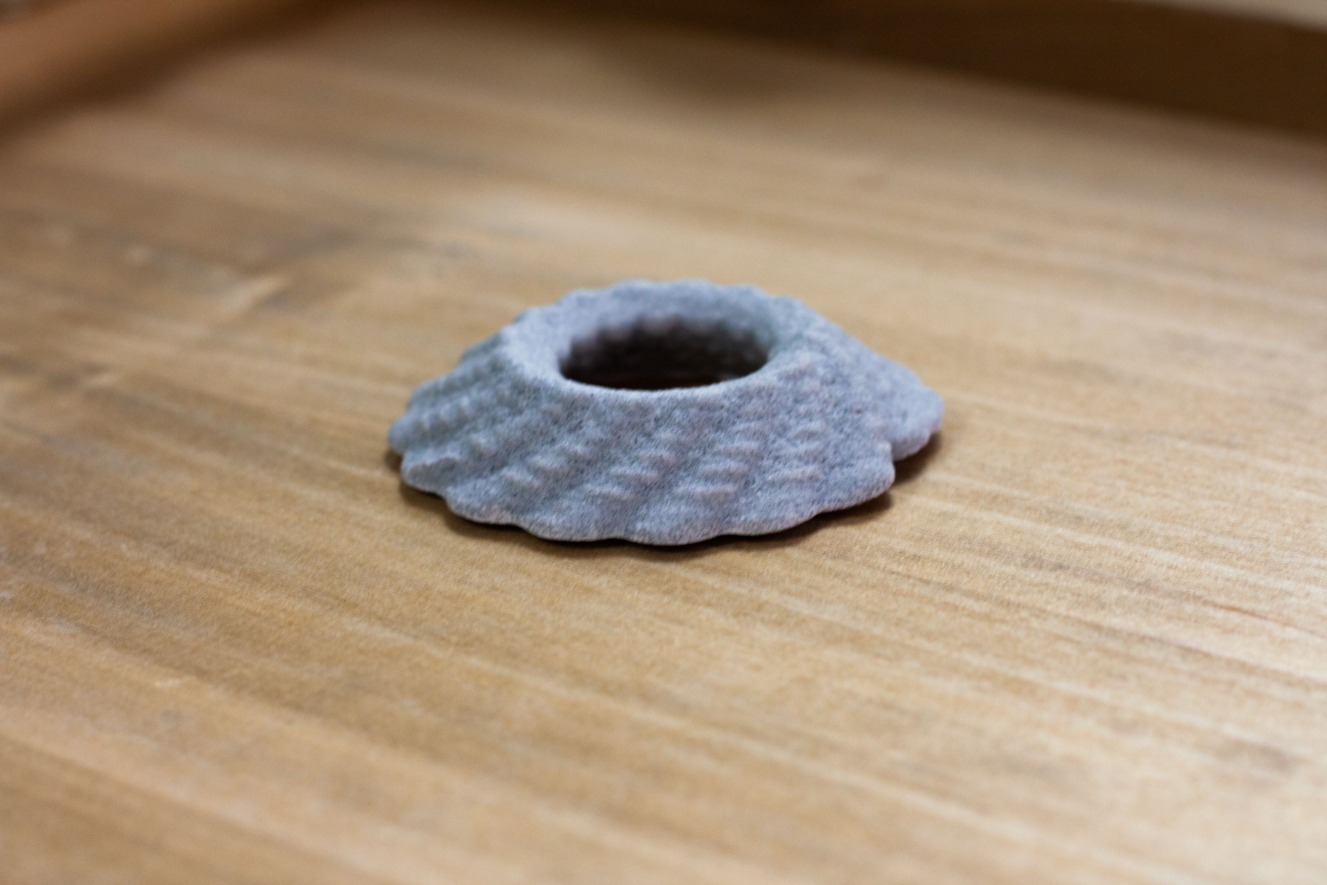 參數幾何彩漸變花叢這次受到國立陽明交通大學建築研究所、應用藝術研究所學生團隊的委託討論土的適合施作程度以及上釉。該學生團隊利用KUKA機器手臂以及自行設計的噴嘴以及推進器來3D列印陶瓷,並使用參數化程式grasshopper來繪製以及切片模型,列印出嚴謹也富含美感的圖樣。最後再委託我們上釉燒製。非常令人激賞的利用科技輔助陶瓷創作的作品。