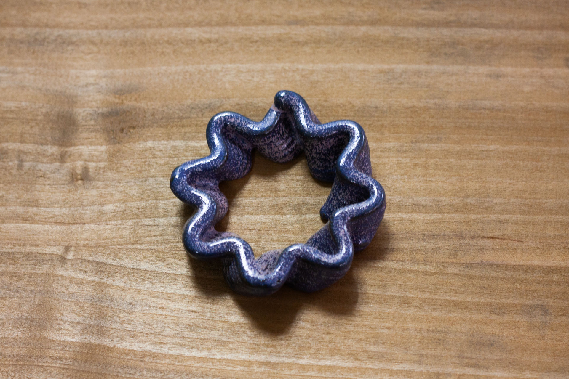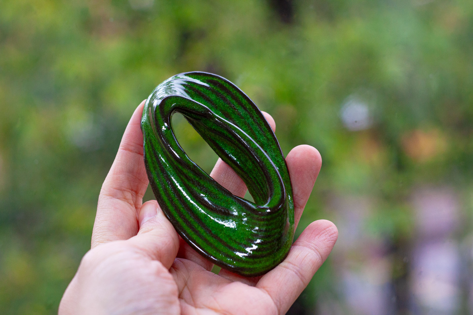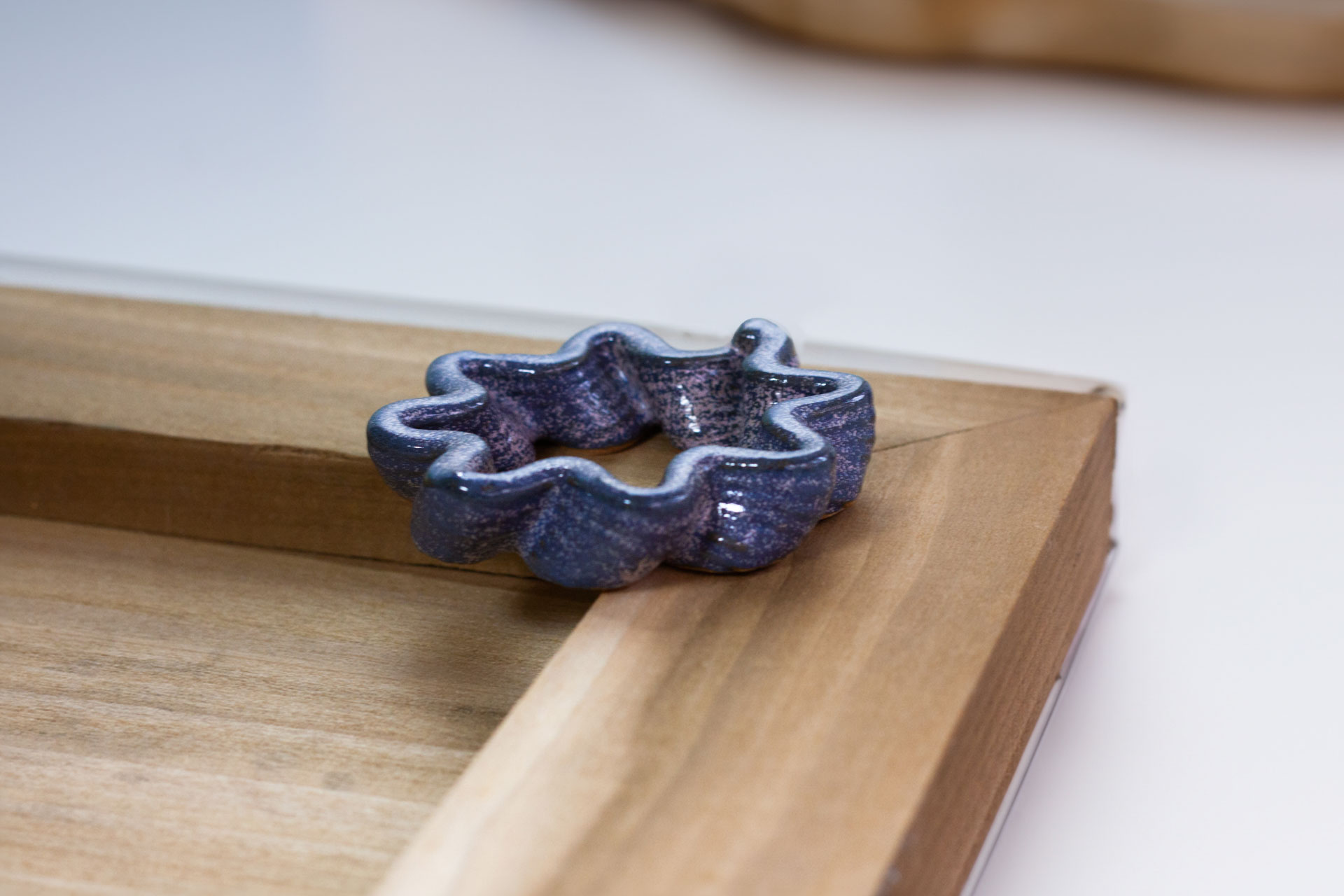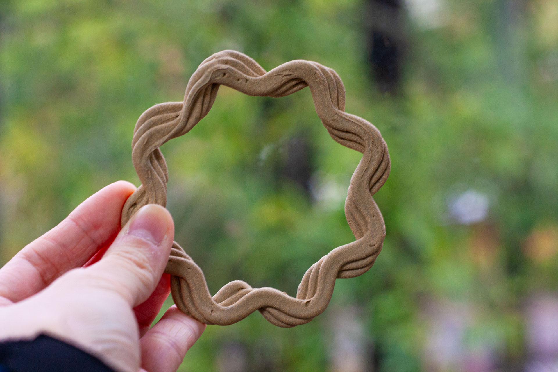 參數幾何彩漸變花叢這次受到國立陽明交通大學建築研究所、應用藝術研究所學生團隊的委託討論土的適合施作程度以及上釉。該學生團隊利用KUKA機器手臂以及自行設計的噴嘴以及推進器來3D列印陶瓷,並使用參數化程式grasshopper來繪製以及切片模型,列印出嚴謹也富含美感的圖樣。最後再委託我們上釉燒製。非常令人激賞的利用科技輔助陶瓷創作的作品。