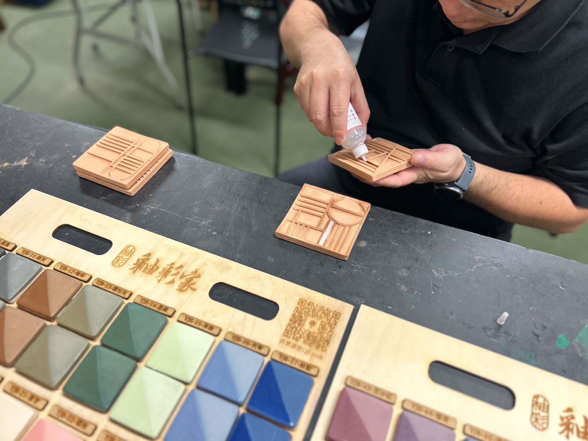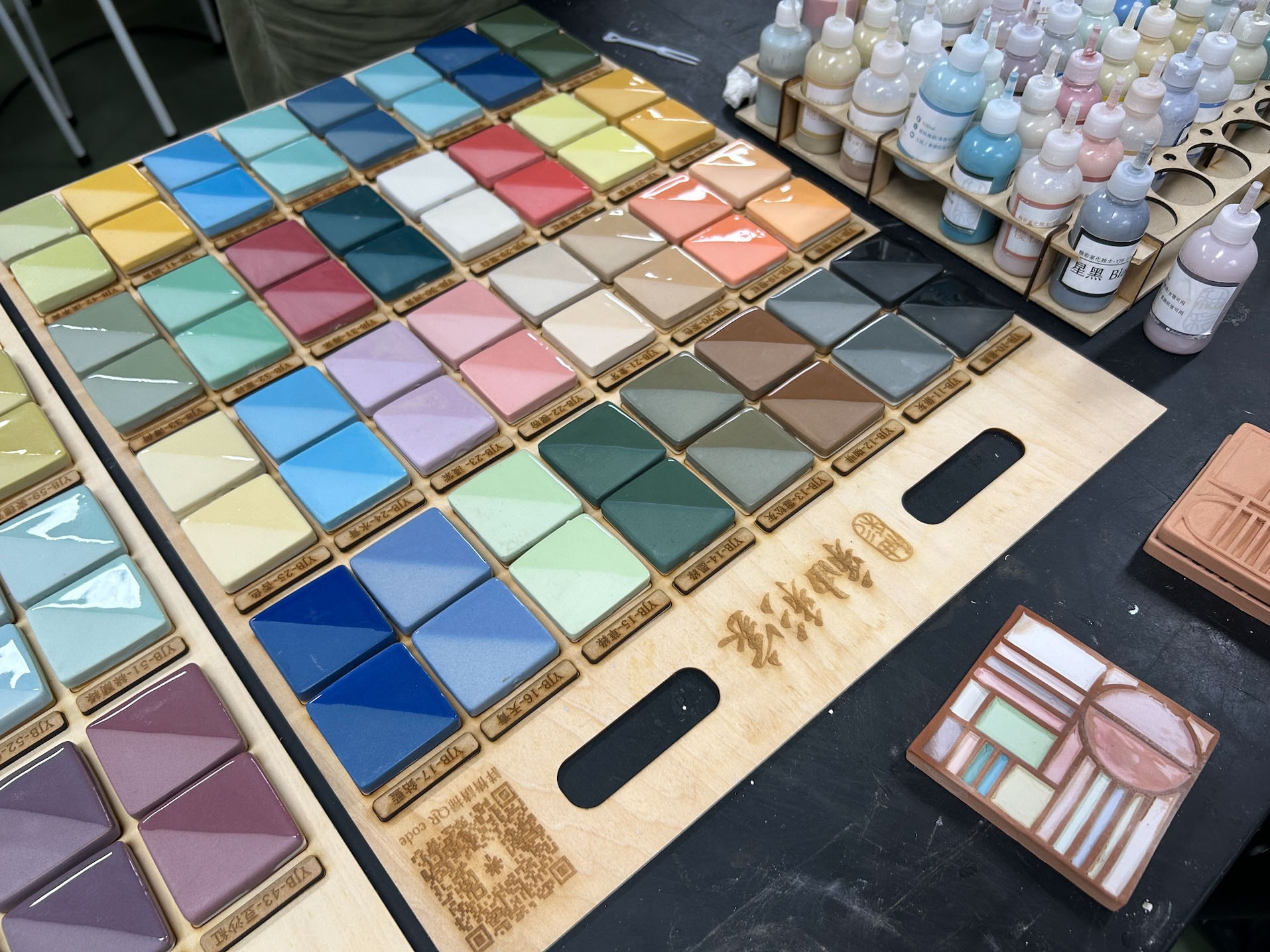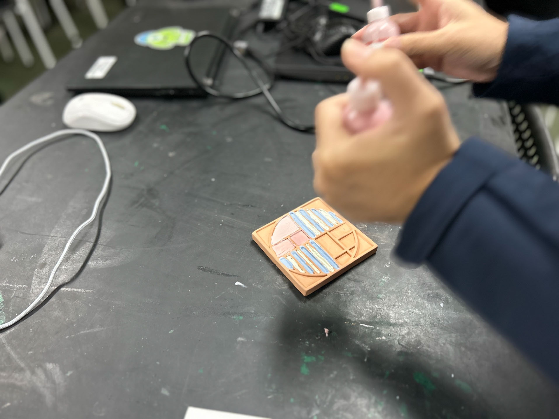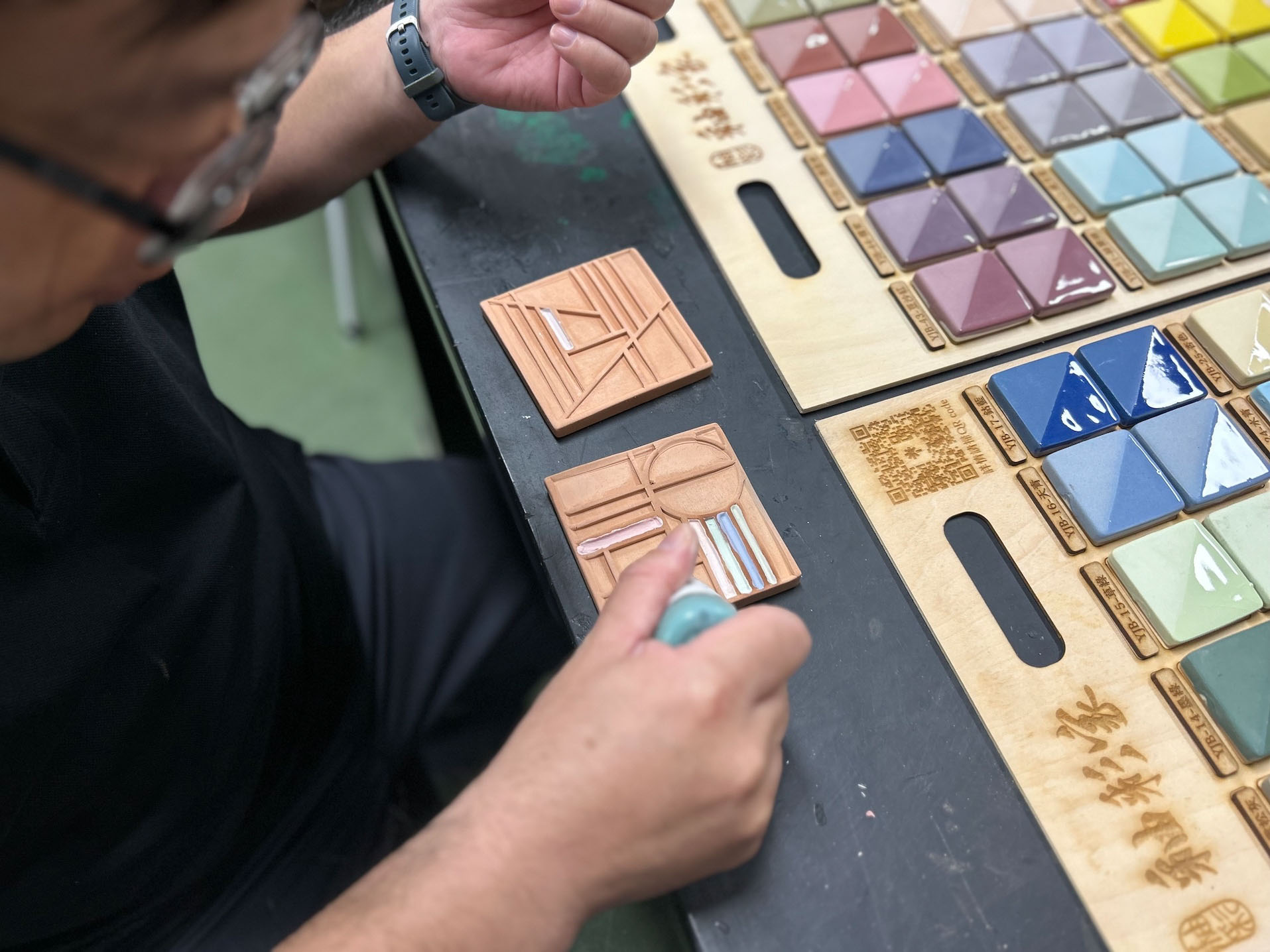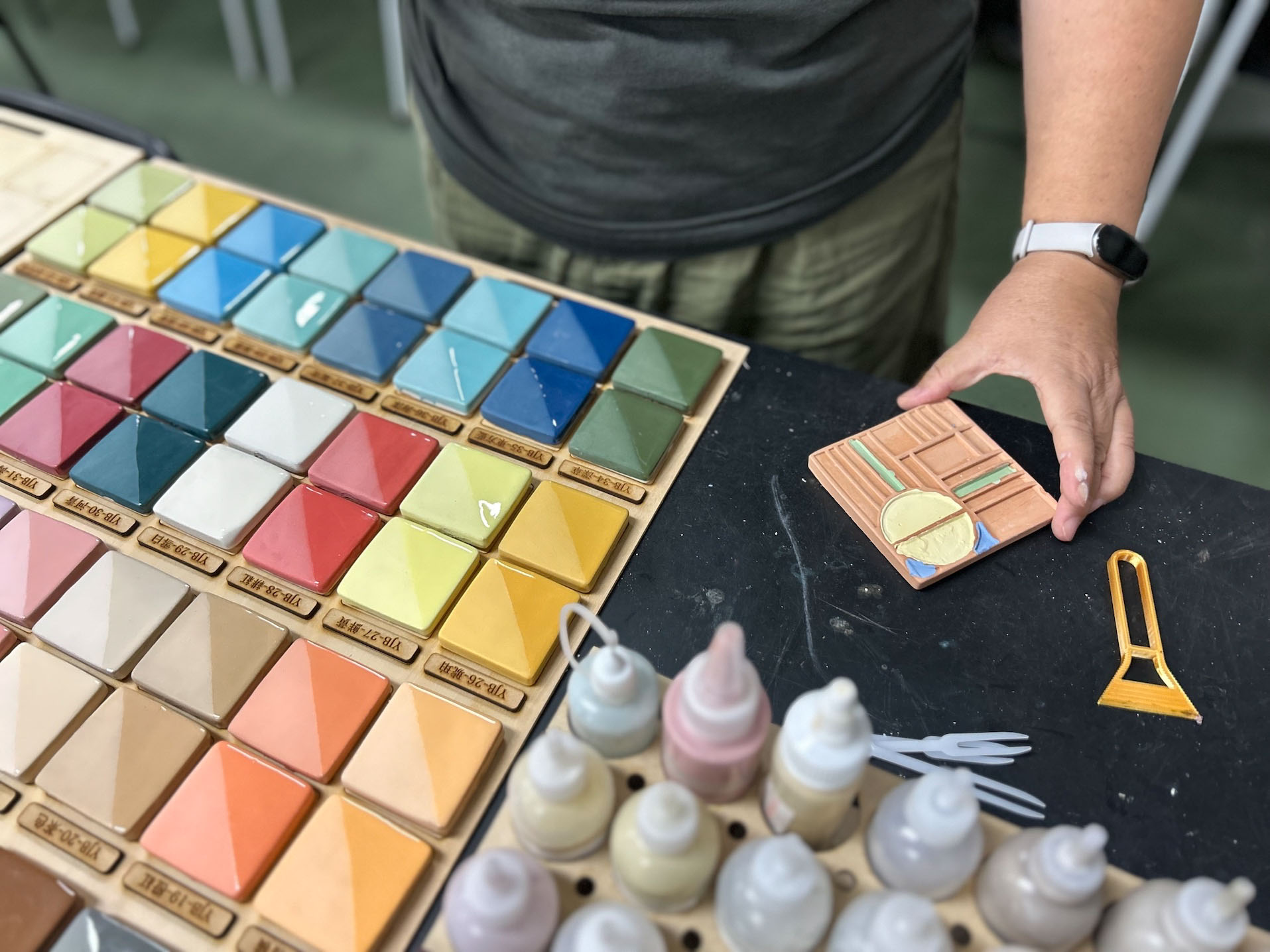 這次請我們來展示陶瓷3D列印技術以及講述我們化妝土的優點以及各種化妝土的技法,並且在先前先製作了有凹凸的花磚的素胚,並且指導與會老師將之填入化妝土後上釉燒成。