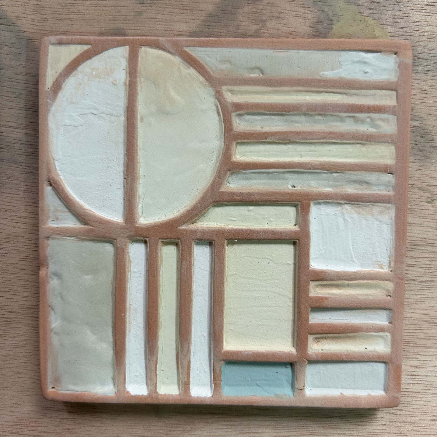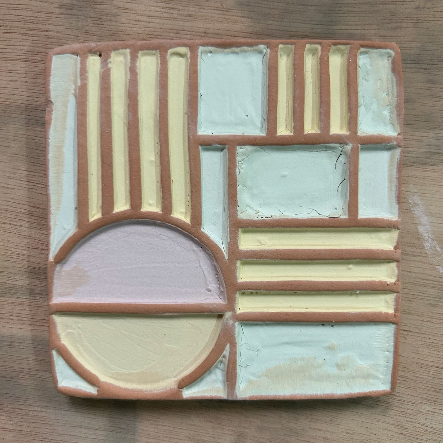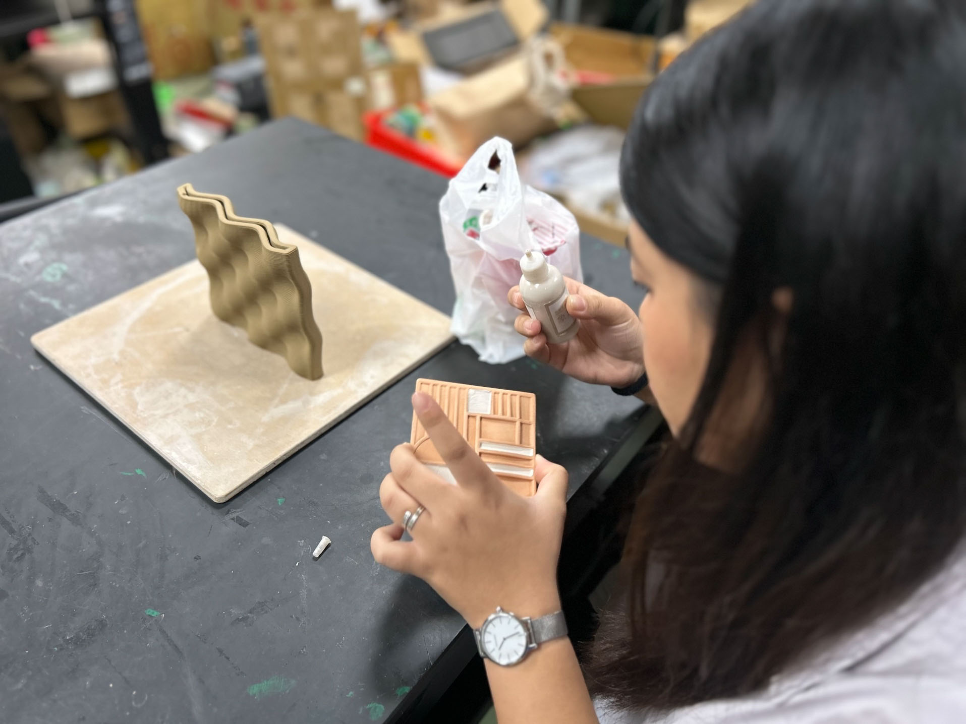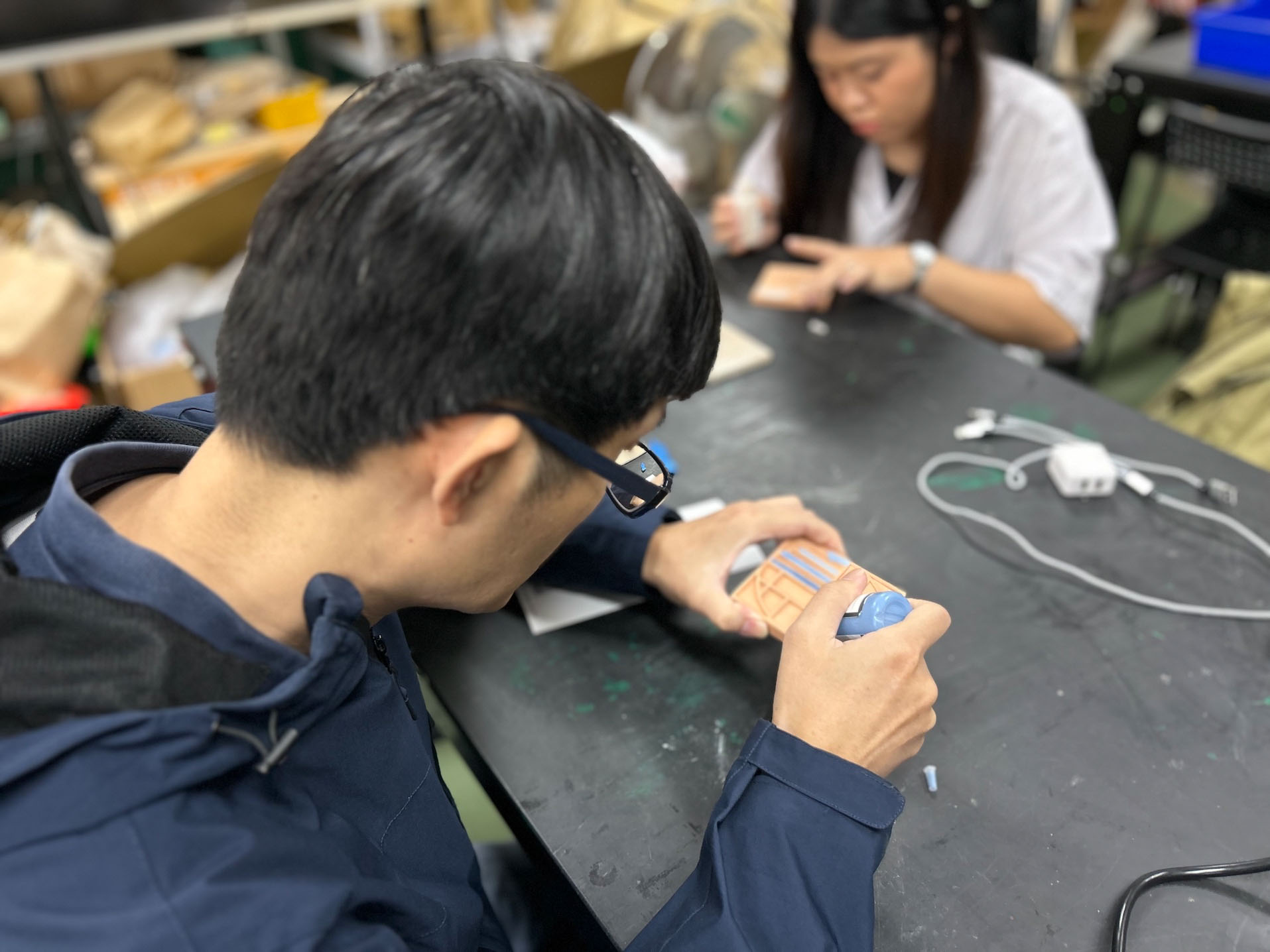 這次請我們來展示陶瓷3D列印技術以及講述我們化妝土的優點以及各種化妝土的技法,並且在先前先製作了有凹凸的花磚的素胚,並且指導與會老師將之填入化妝土後上釉燒成。