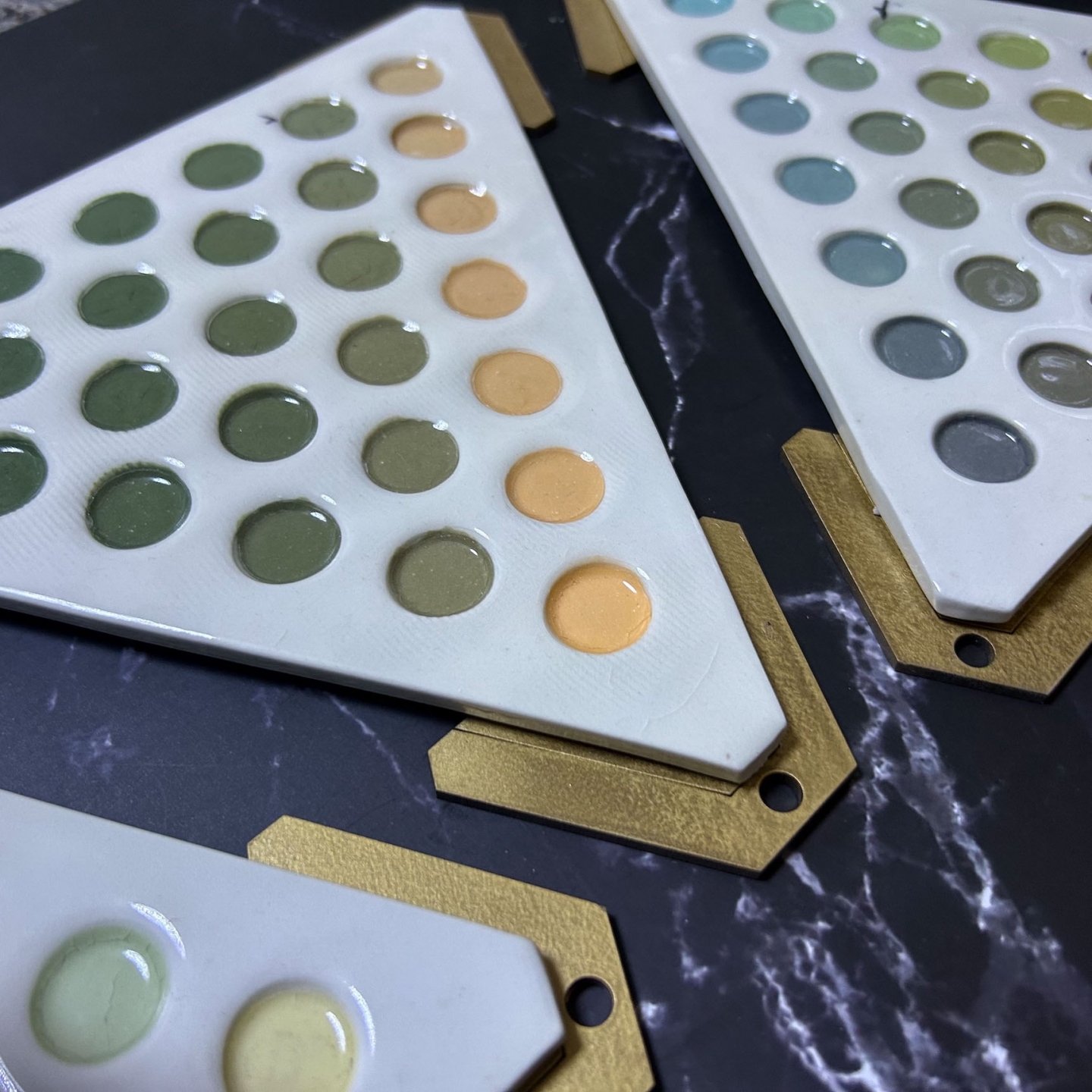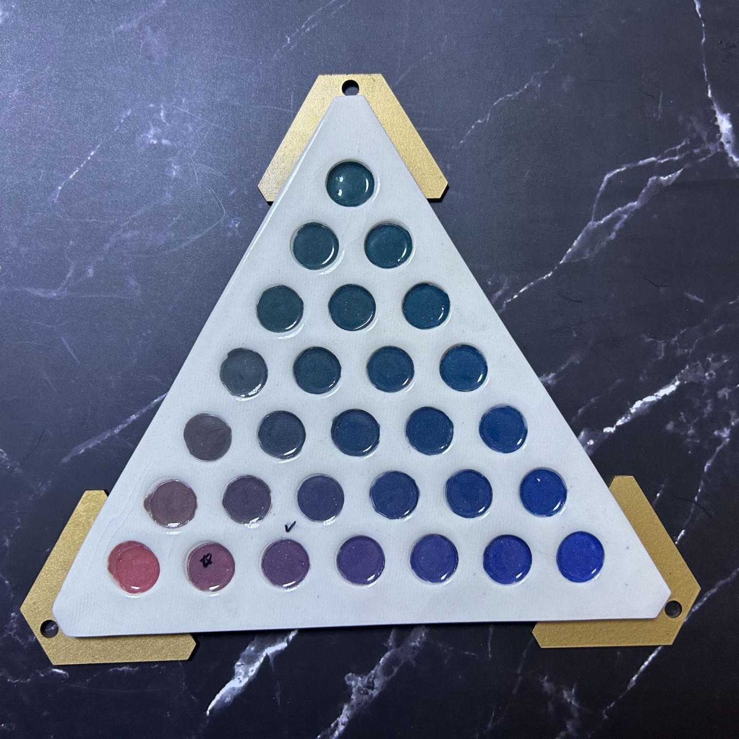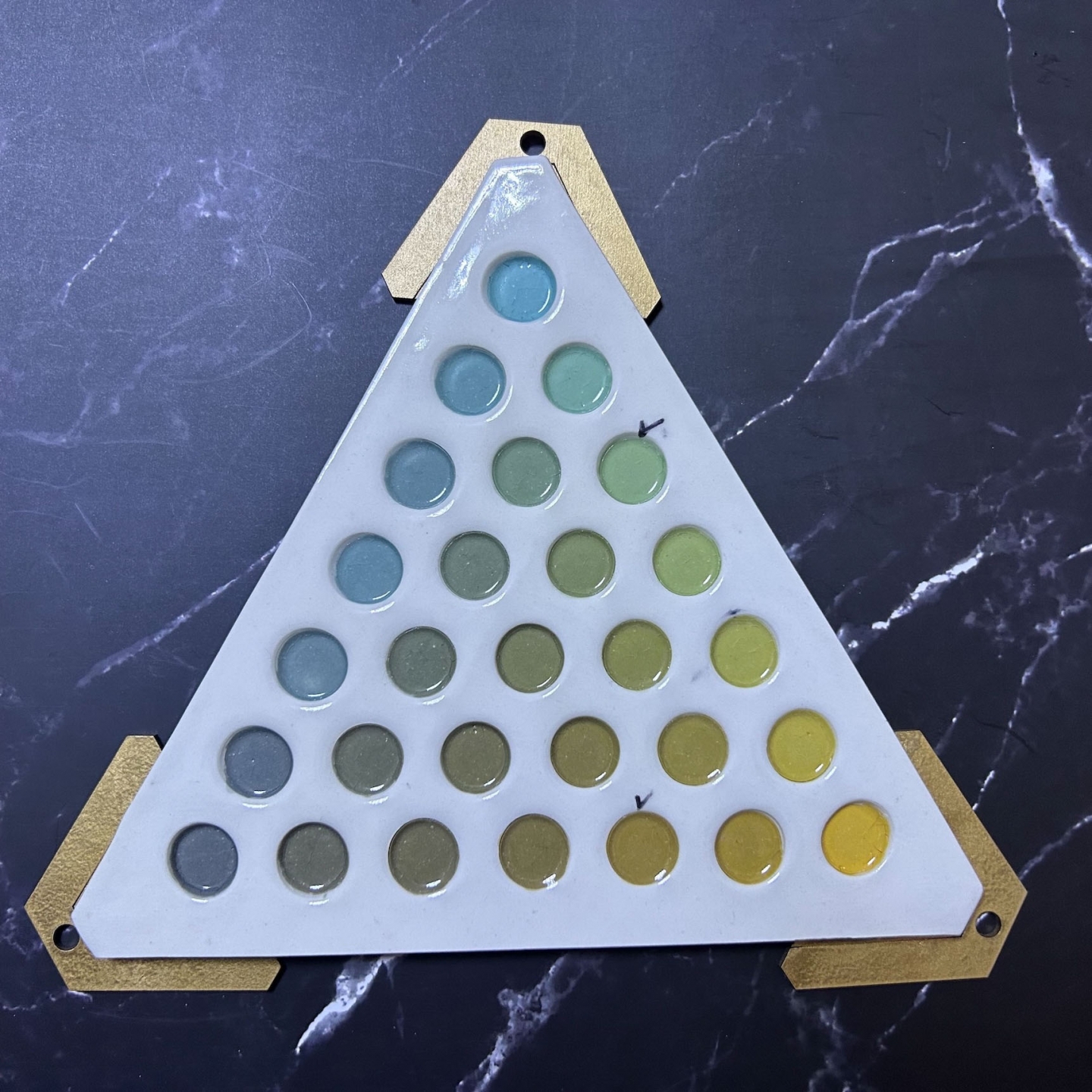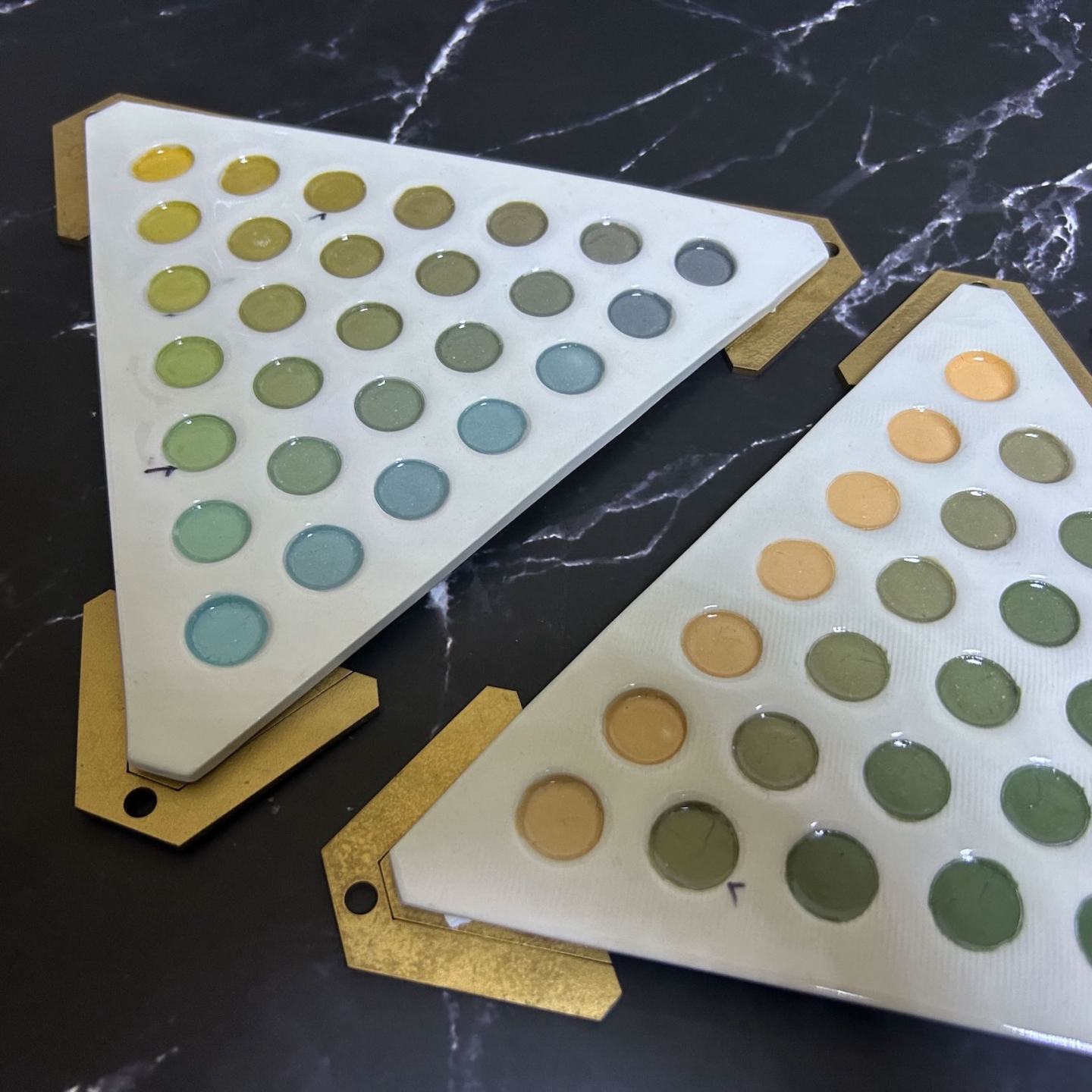 我們時常會需要接受客戶不同的顏色委託,通常都是在現成的化妝土顏色中挑選無果希望可以更加飽和或是其他我們沒有的顏色時,我們就會進行三元的顏色測試,先將顏色分色,而後在三個角落調整客戶所預期的顏色組成,就可以得到這三種顏色的所有組合,只要客戶想要的顏色有試驗成功,便可以直接進行配置。使用此法中間也省略了大量的時間以及成本,可以快速的得到結果以及配方。