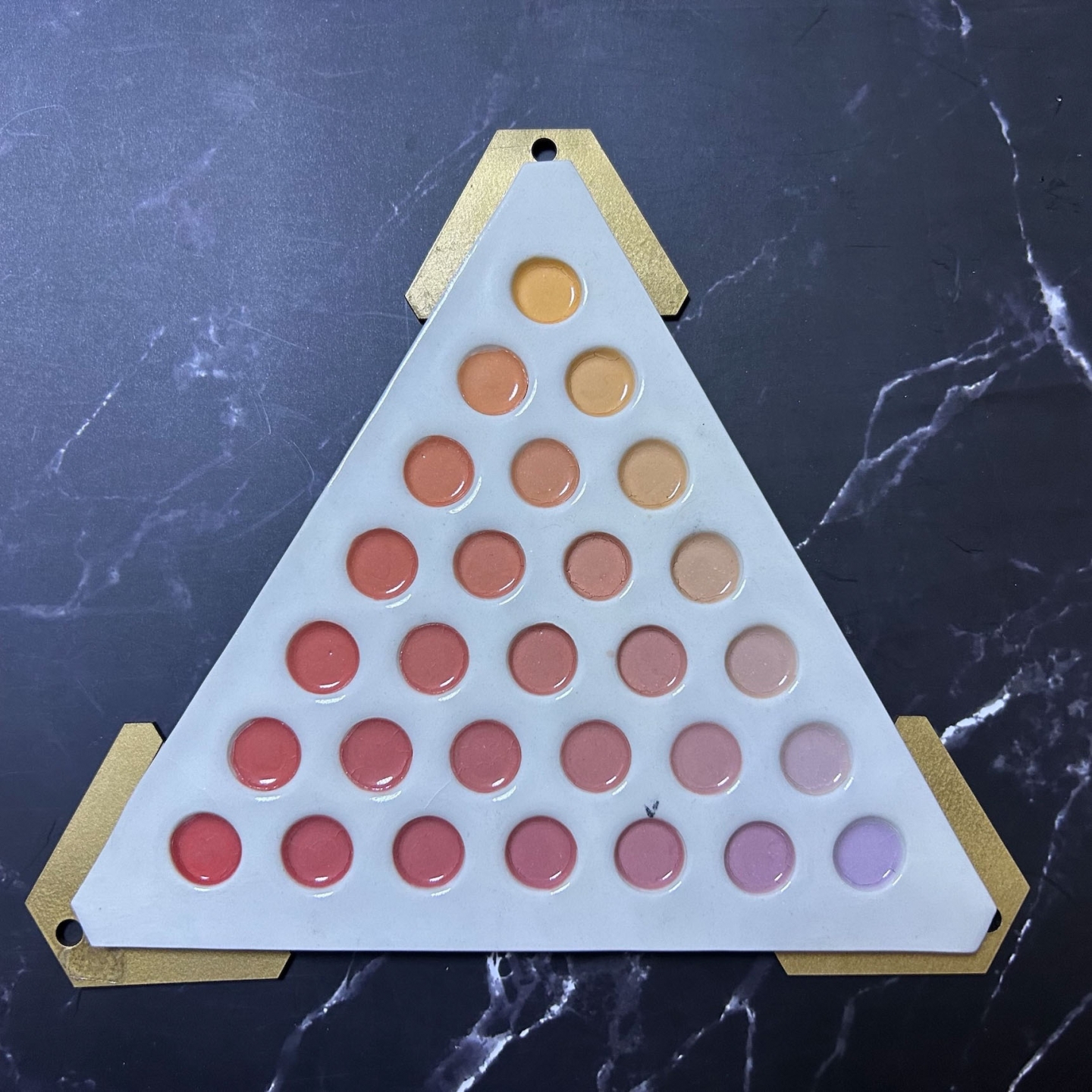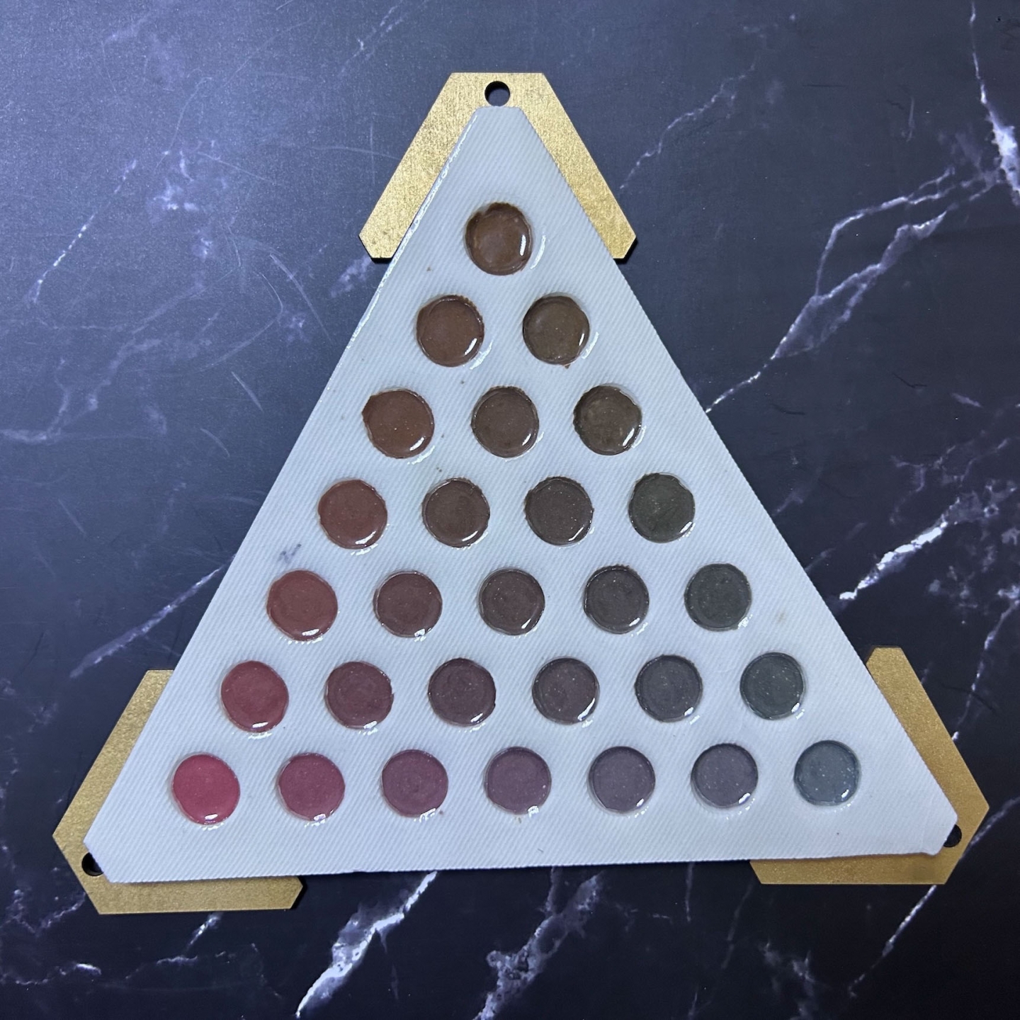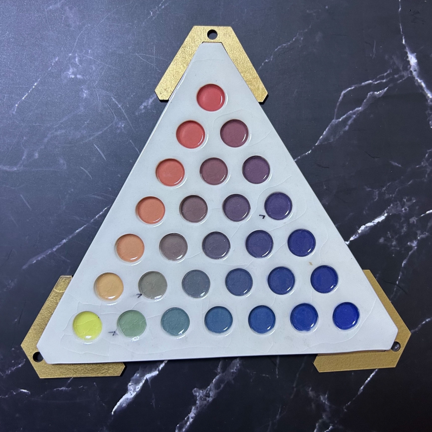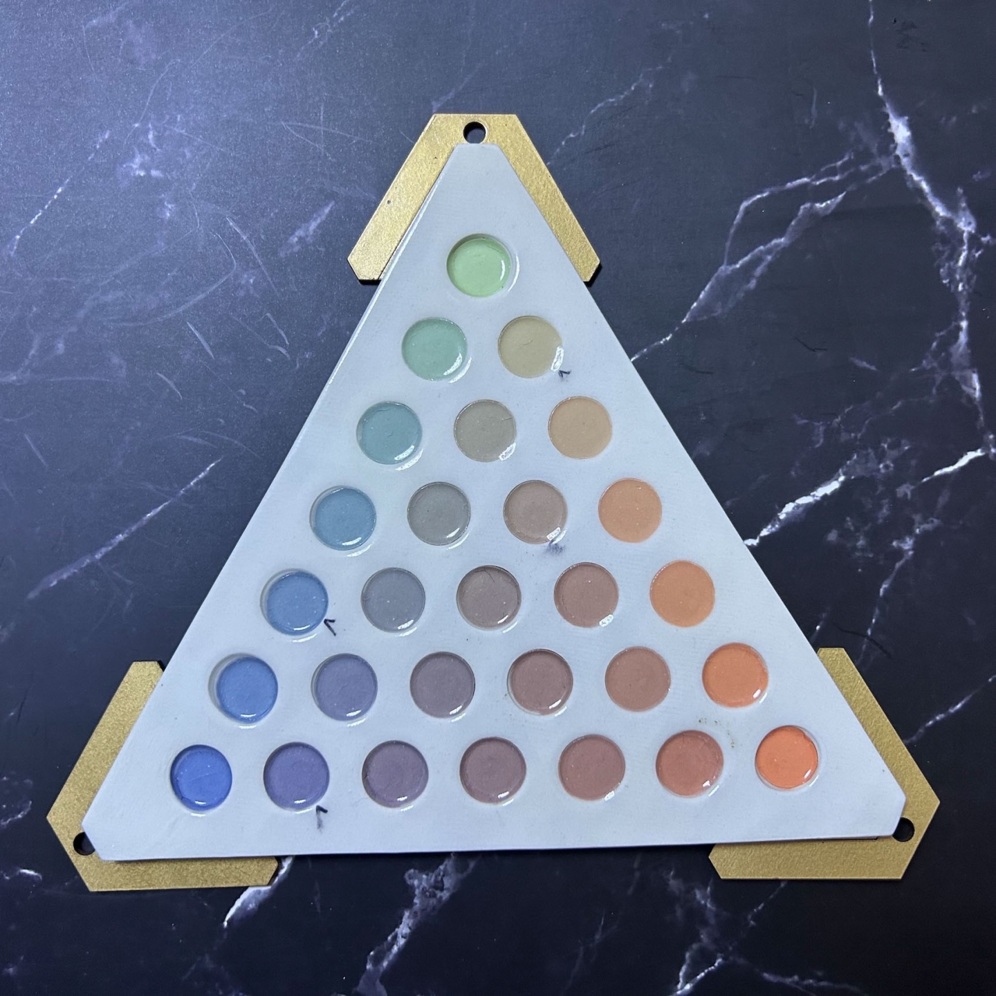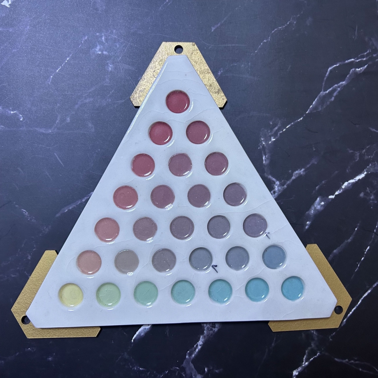 我們時常會需要接受客戶不同的顏色委託,通常都是在現成的化妝土顏色中挑選無果希望可以更加飽和或是其他我們沒有的顏色時,我們就會進行三元的顏色測試,先將顏色分色,而後在三個角落調整客戶所預期的顏色組成,就可以得到這三種顏色的所有組合,只要客戶想要的顏色有試驗成功,便可以直接進行配置。使用此法中間也省略了大量的時間以及成本,可以快速的得到結果以及配方。