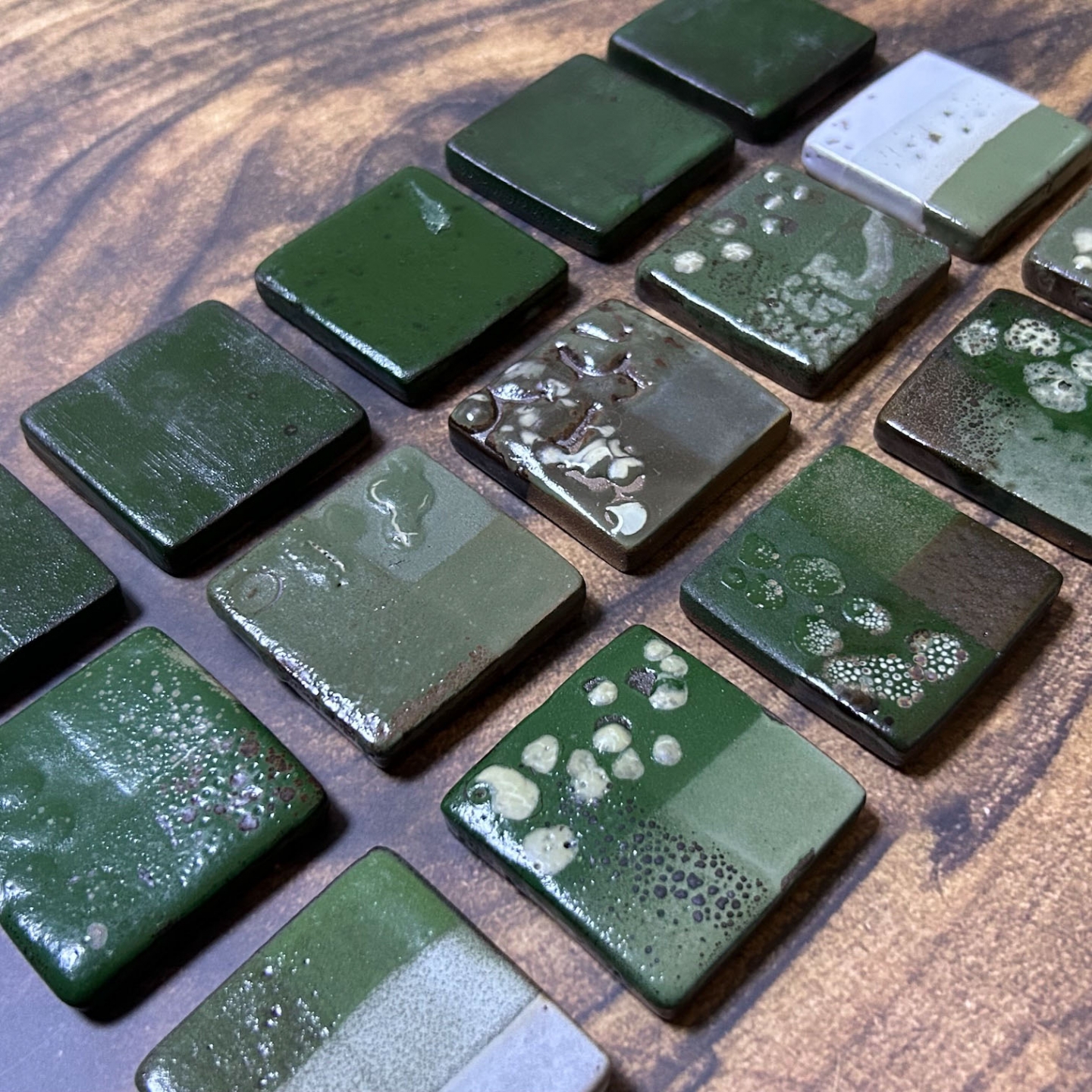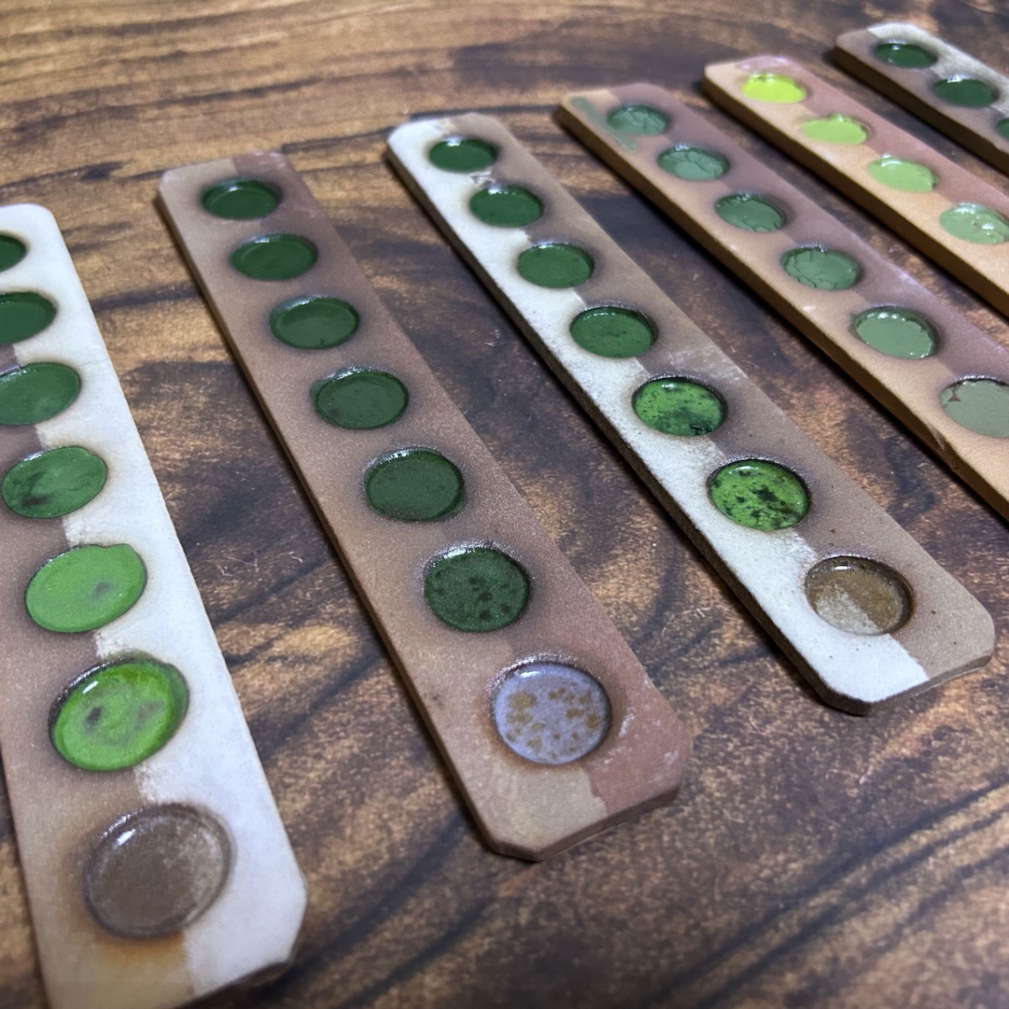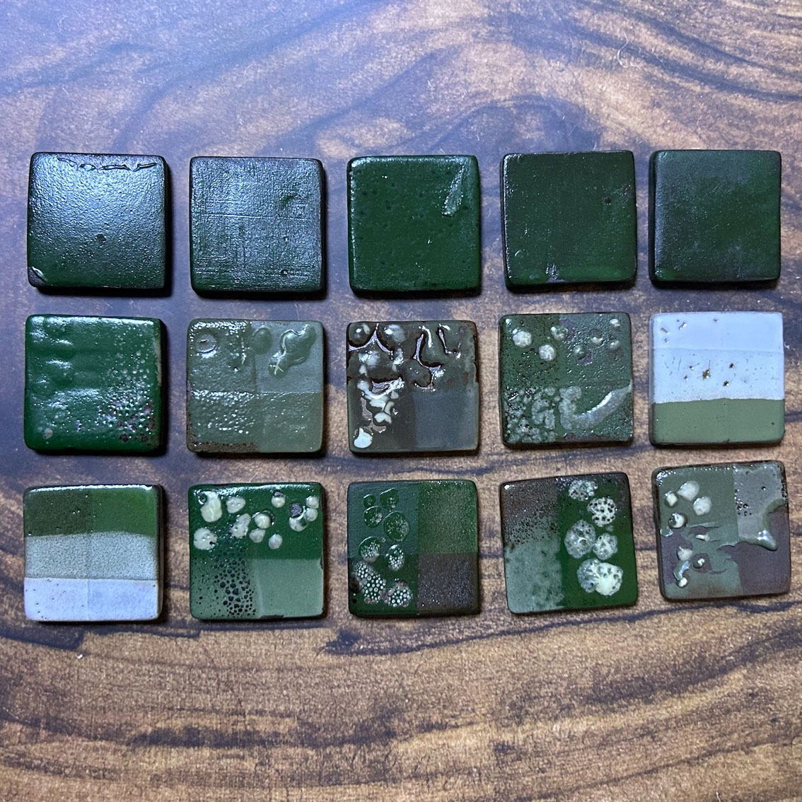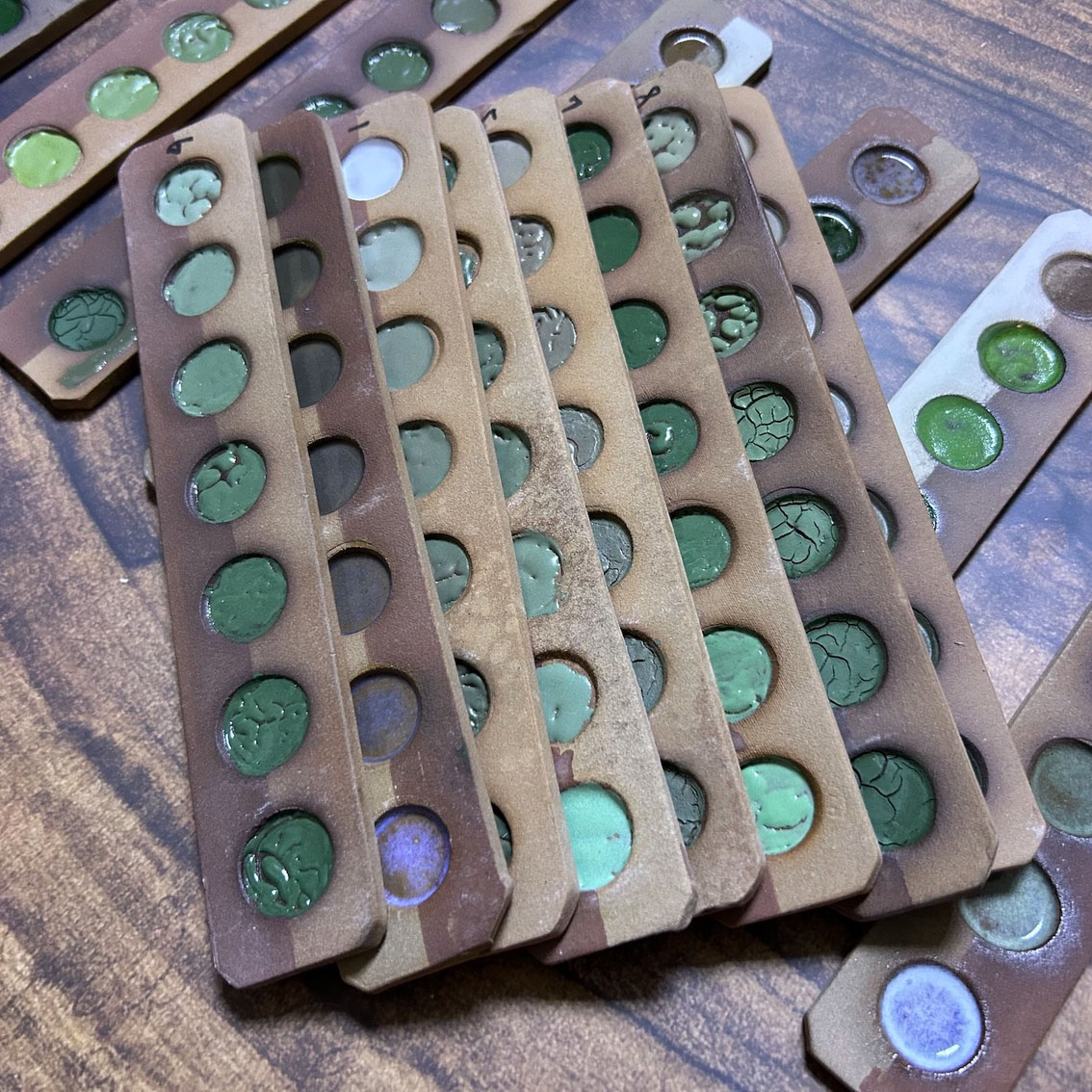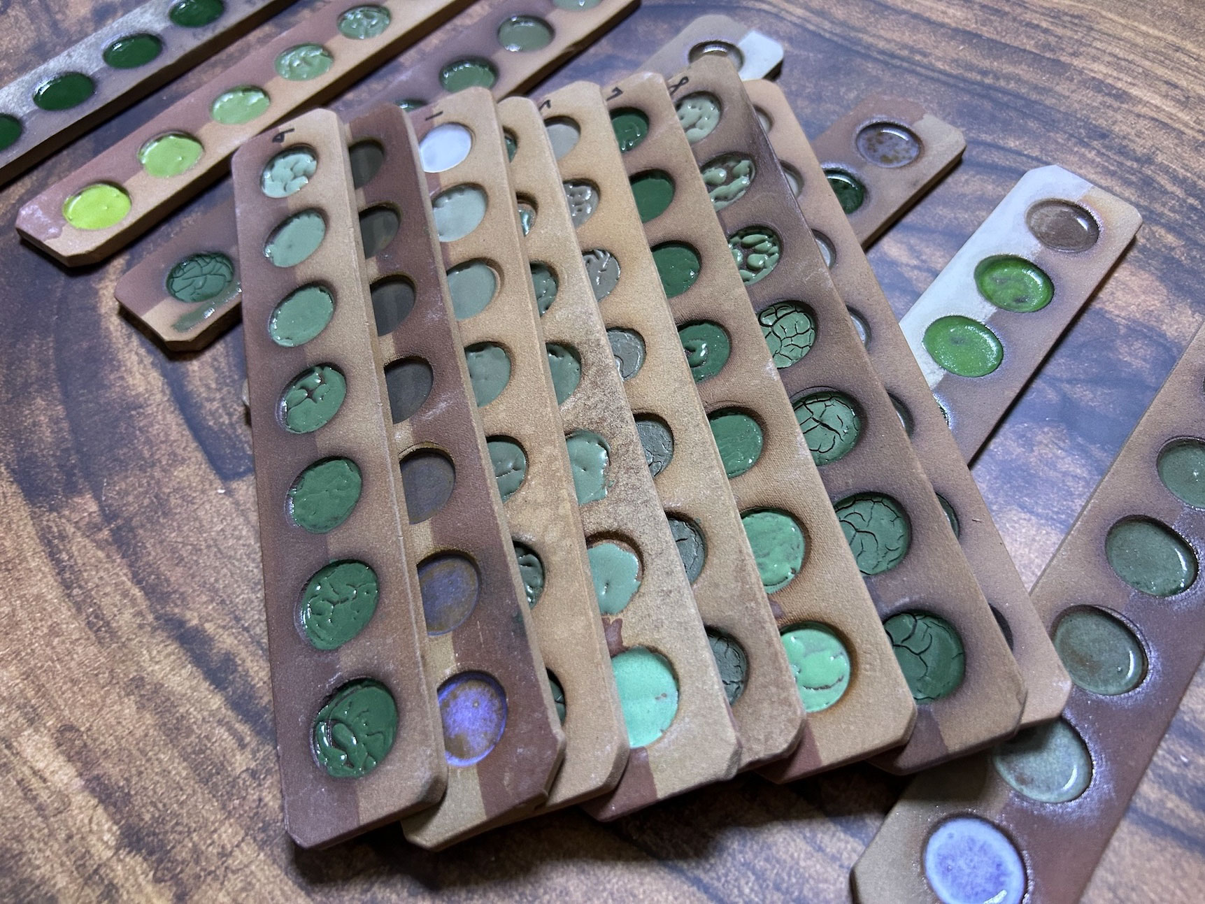 受到客戶開發綠釉作為傢俱設計的特殊顏色。此案子客戶挑選釉彩家資料庫中的三種銅綠以及鉻綠釉作為基底,希望先發散出多種綠色。我們先以二元測試,使用自製的試片先進行多樣的嘗試;部分進行發色劑漸進的實驗,其它為在兩端點使用不同釉藥,並以不同比例網中間混合,最中間的就是兩個端點釉方1:1的呈現。客戶還未確定屆時使用的土種,因此我們的試片同時可以看到瓷土、陶土以及紫紅土的成色。