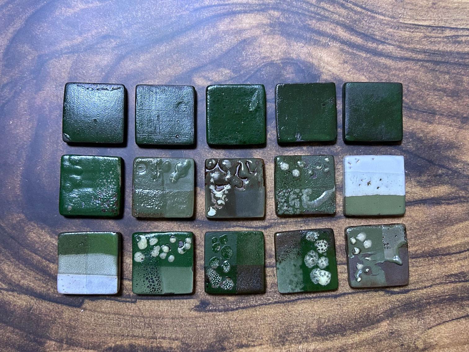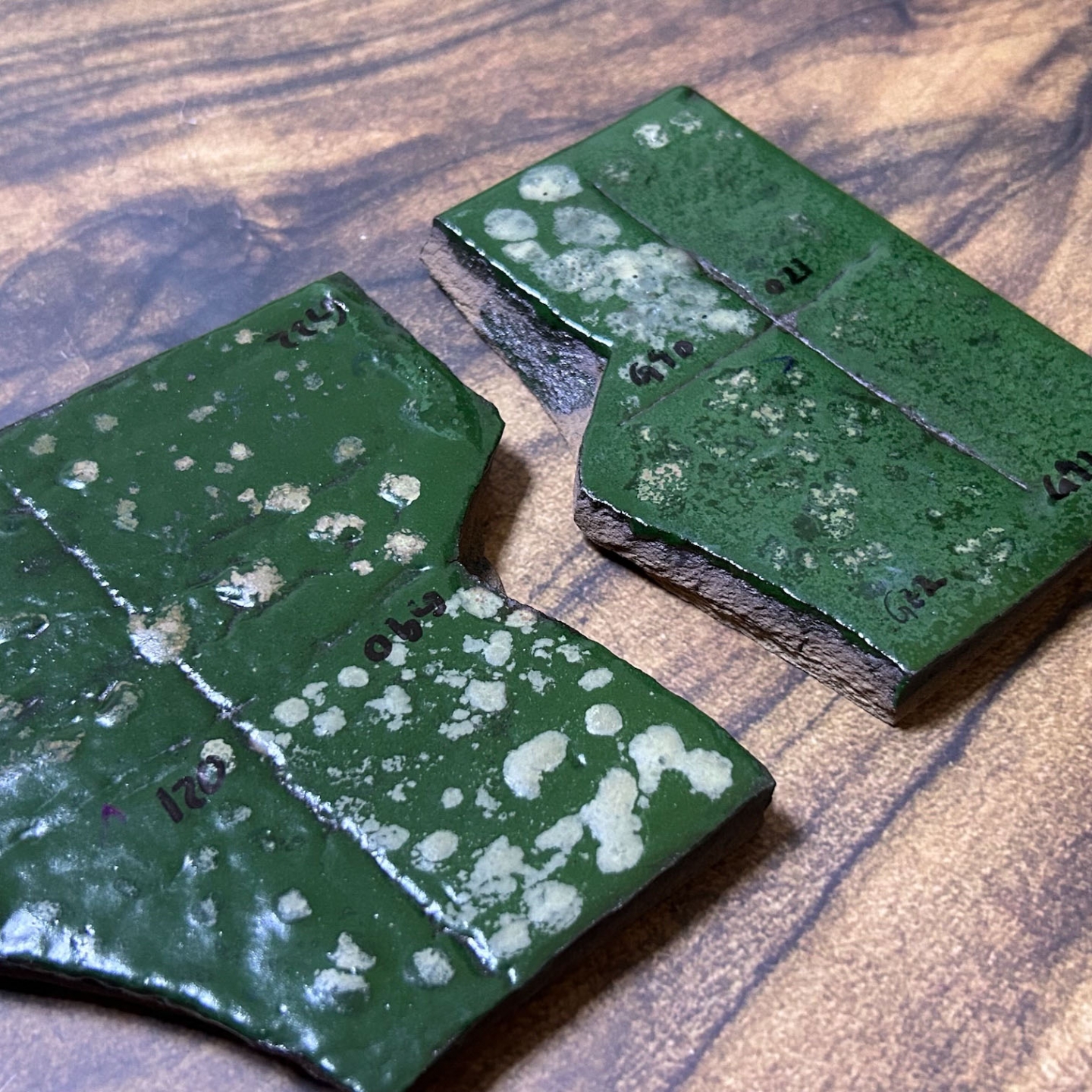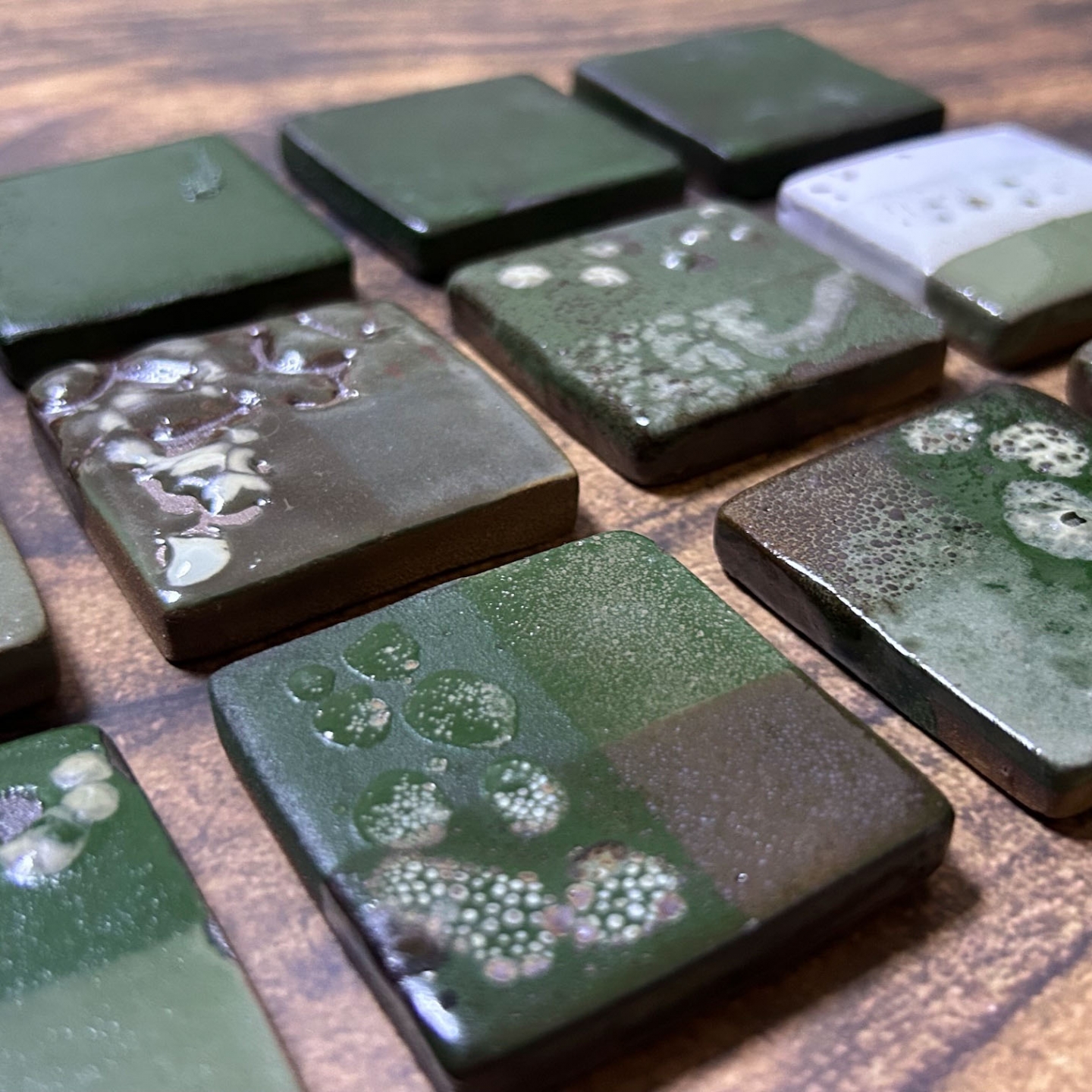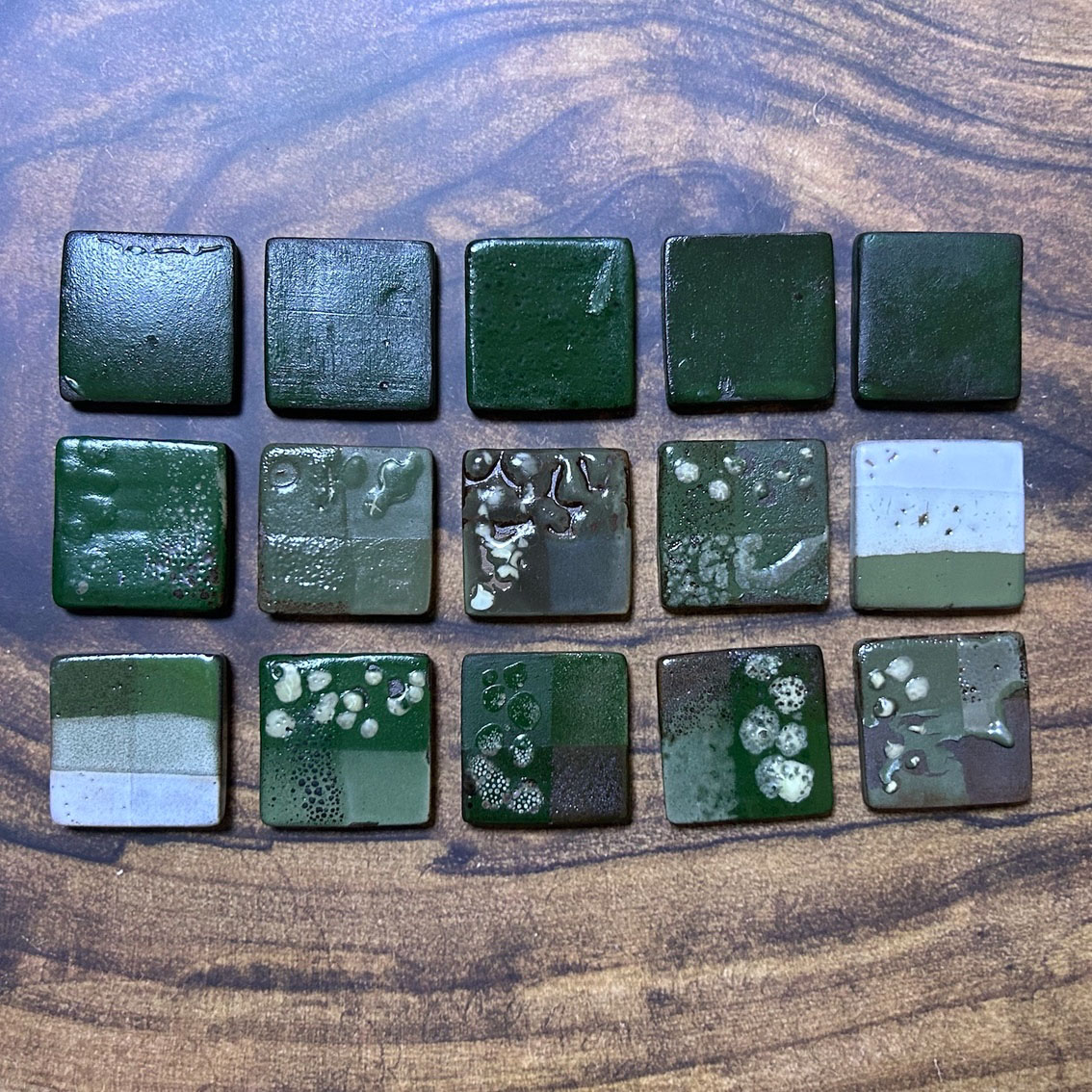 受到客戶開發綠釉作為傢俱設計的特殊顏色。此案子客戶挑選釉彩家資料庫中的三種銅綠以及鉻綠釉作為基底,希望先發散出多種綠色。我們先以二元測試,使用自製的試片先進行多樣的嘗試;部分進行發色劑漸進的實驗,其它為在兩端點使用不同釉藥,並以不同比例網中間混合,最中間的就是兩個端點釉方1:1的呈現。客戶還未確定屆時使用的土種,因此我們的試片同時可以看到瓷土、陶土以及紫紅土的成色。