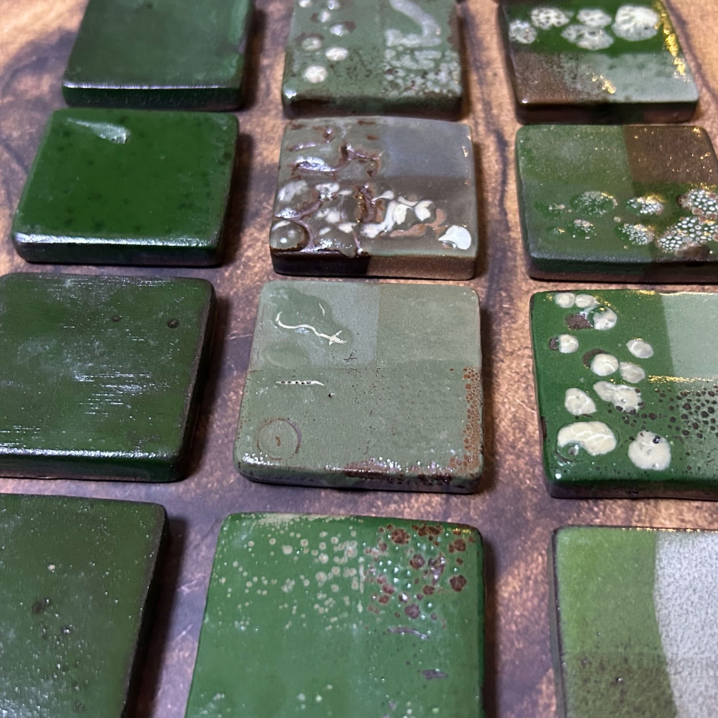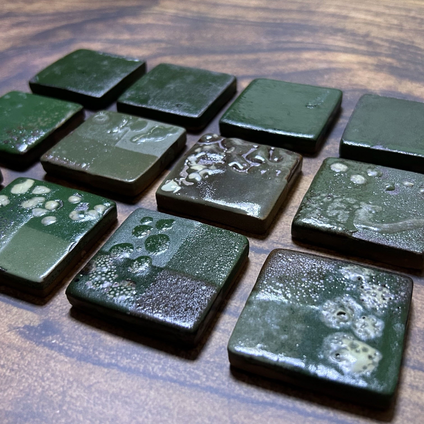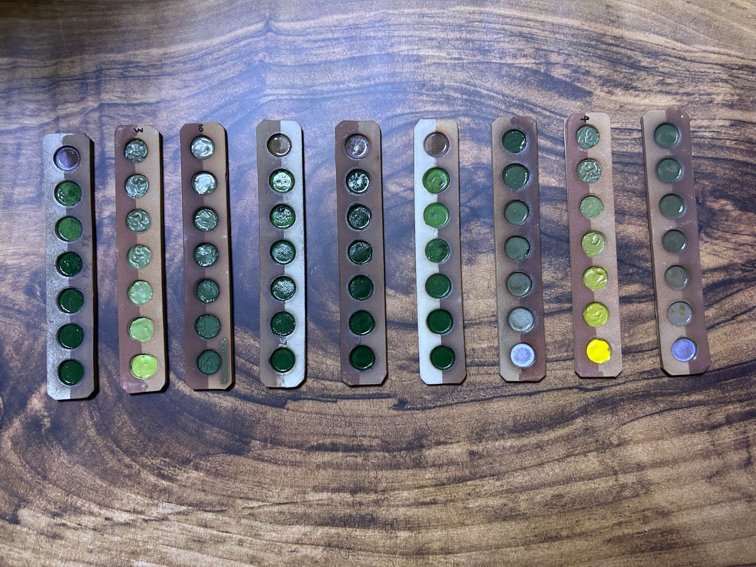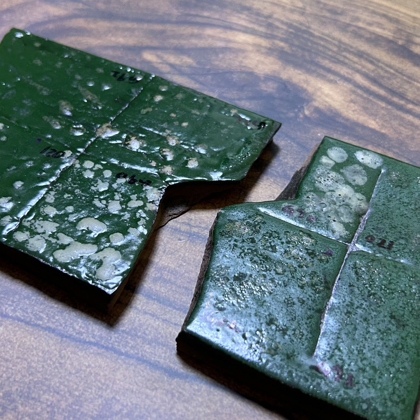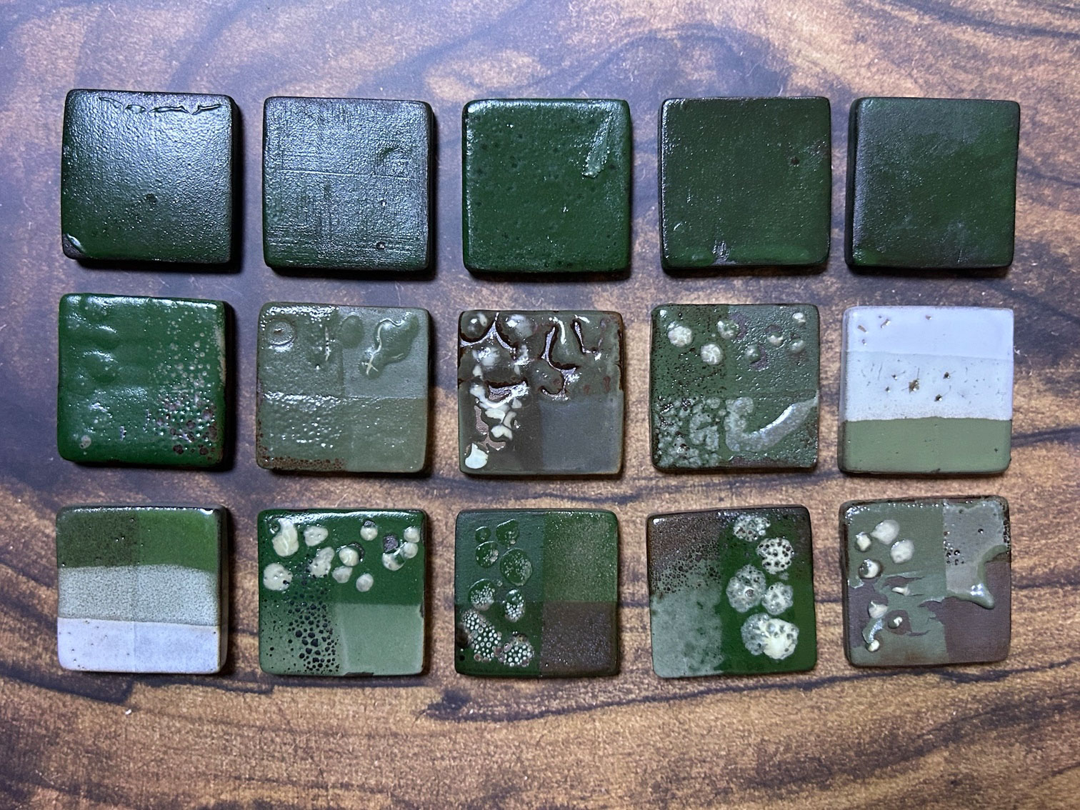 受到客戶開發綠釉作為傢俱設計的特殊顏色。此案子客戶挑選釉彩家資料庫中的三種銅綠以及鉻綠釉作為基底,希望先發散出多種綠色。我們先以二元測試,使用自製的試片先進行多樣的嘗試;部分進行發色劑漸進的實驗,其它為在兩端點使用不同釉藥,並以不同比例網中間混合,最中間的就是兩個端點釉方1:1的呈現。客戶還未確定屆時使用的土種,因此我們的試片同時可以看到瓷土、陶土以及紫紅土的成色。